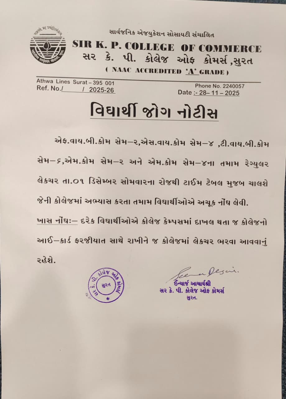 કોલેજમાં અભ્યાસ કરતા તમામ વિધાર્થીઓને માટે કોલેજમાં લેક્ચર શરૂ 01 ડીસેમ્બર સોમવારના રોજથી ટાઈમ ટેબલ મુજબ ચાલશે જેથી દરેક વિધાર્થીઓએ લેક્ચરમાં અચૂક હાજરી આપવી