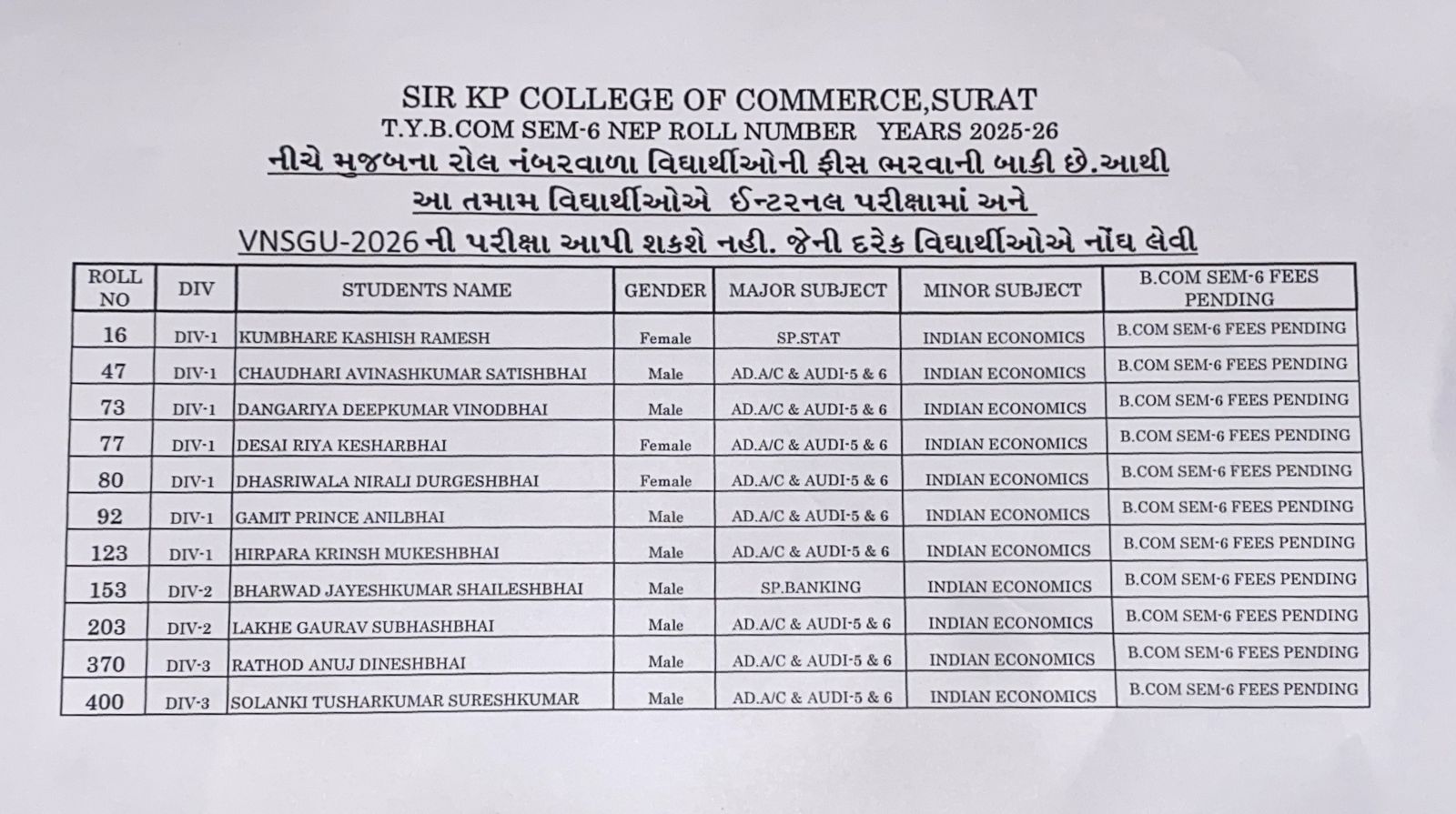 નીચે આપેલ PDF માં T.Y.COM SEM -6 ની ફીસ ભરવાની વારંવાર સૂચના આપ્યા છતાં ફીસ ભરેલ નથી આથી ફીસ VNSGU મોકલવાની બાકી રહી જતા આ તમામ વિધાર્થીઓને LEFT જાહેર કરેલ છે તથા 9 ફેબ્રુઆરીથી લેવાનારી ઇન્ટર્નલ પરીક્ષા અને માર્ચ- 2026માં લેવાનારી VNSGUની પરીક્ષામાં બેસી શકશે નહીં જેની દરેક વિધાર્થીઓએ ગંભીરતાથી નોંધ લેવી.