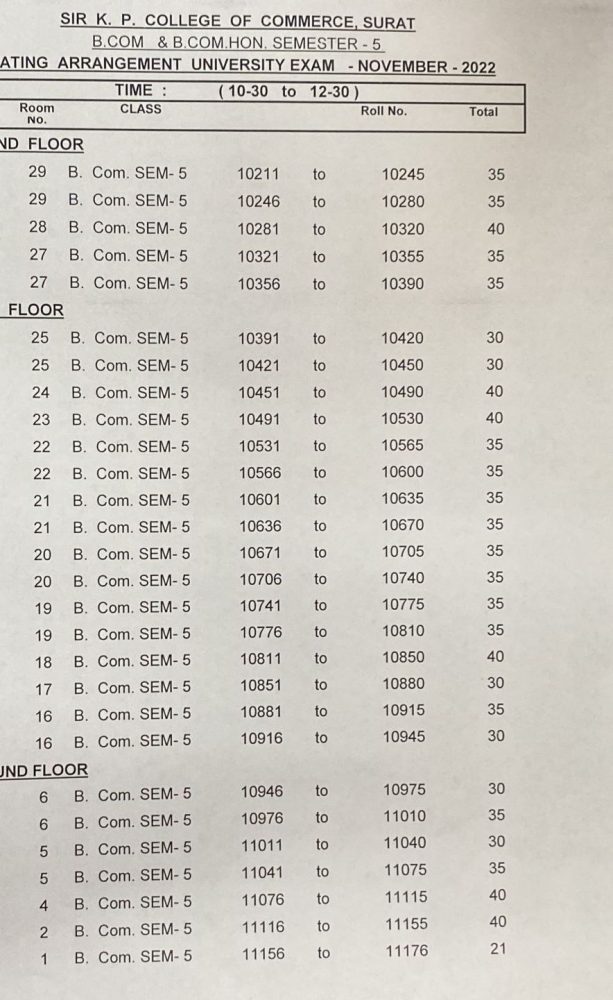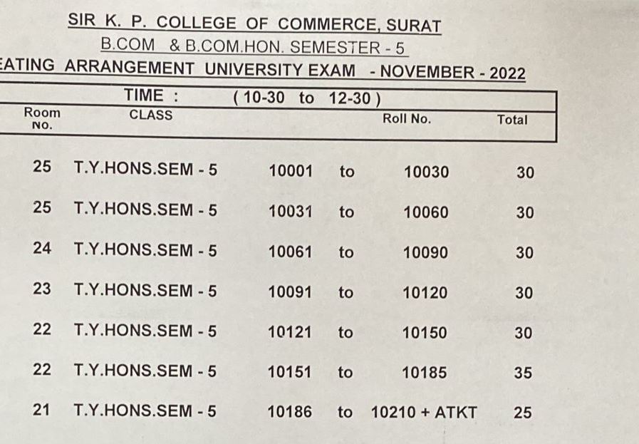 T.Y.B.COM. SEM-V & T.Y.B.COM. HONORS SEM-V SETAING ARRANGEMENT UNIVERSITY EXAM NOV-2022