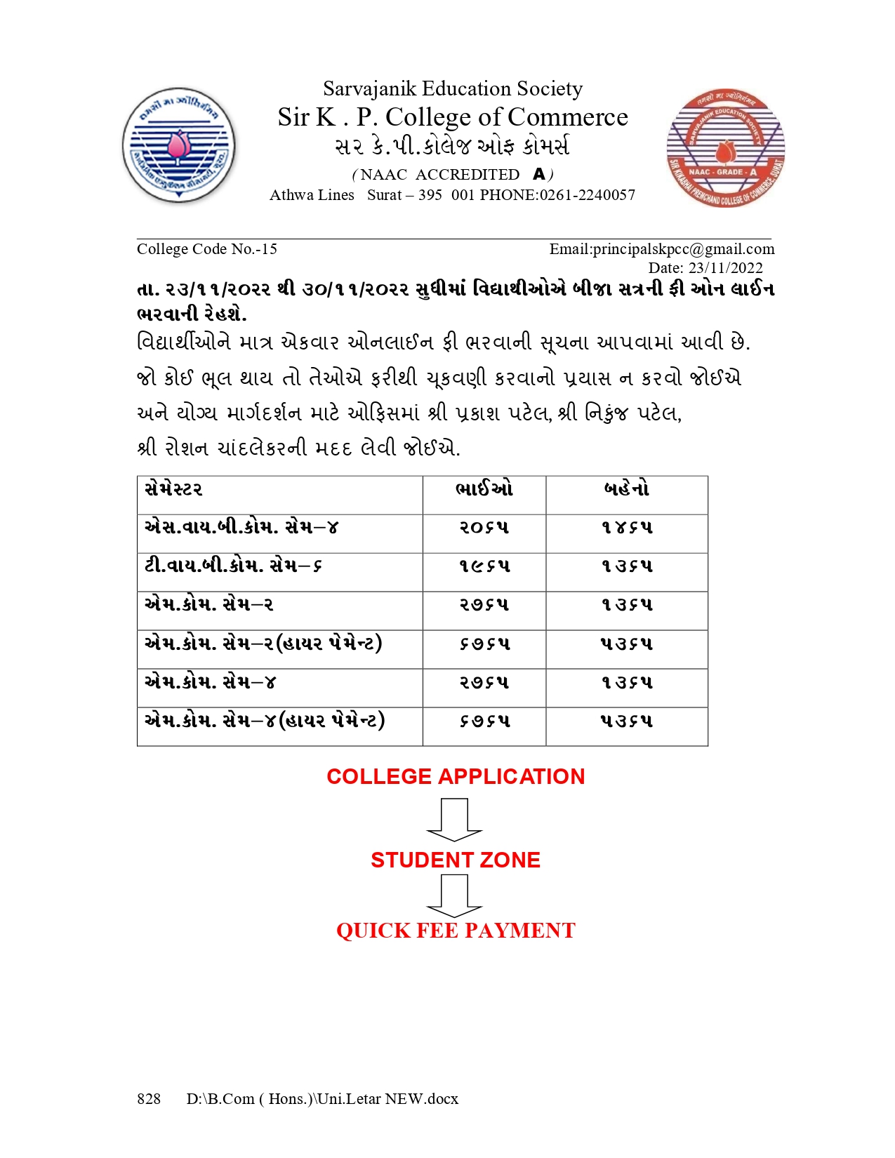 બીજા સત્ર ની ફી ભરવા ની નોટીસ.