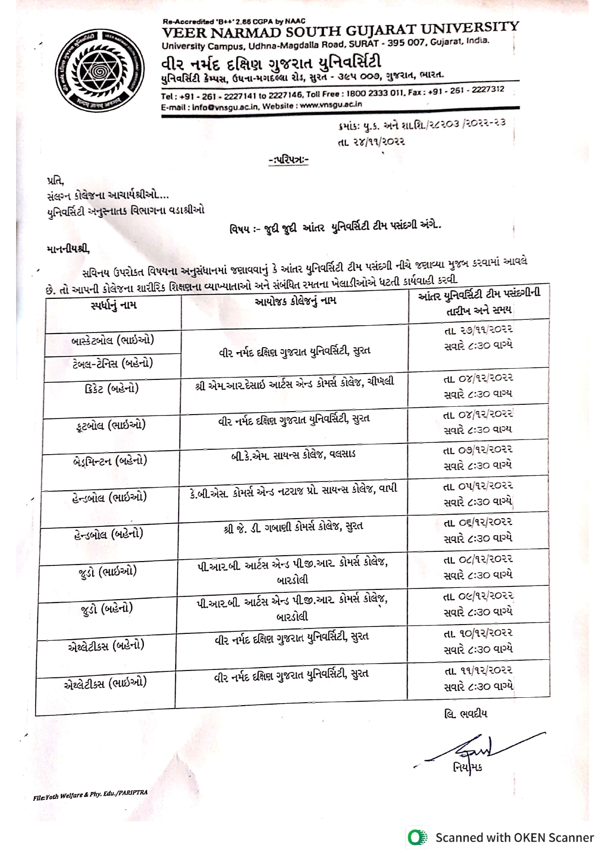 જુદી જુદી આંતર યુનિવર્સીટી ટીમ પસંદગી અંગે.