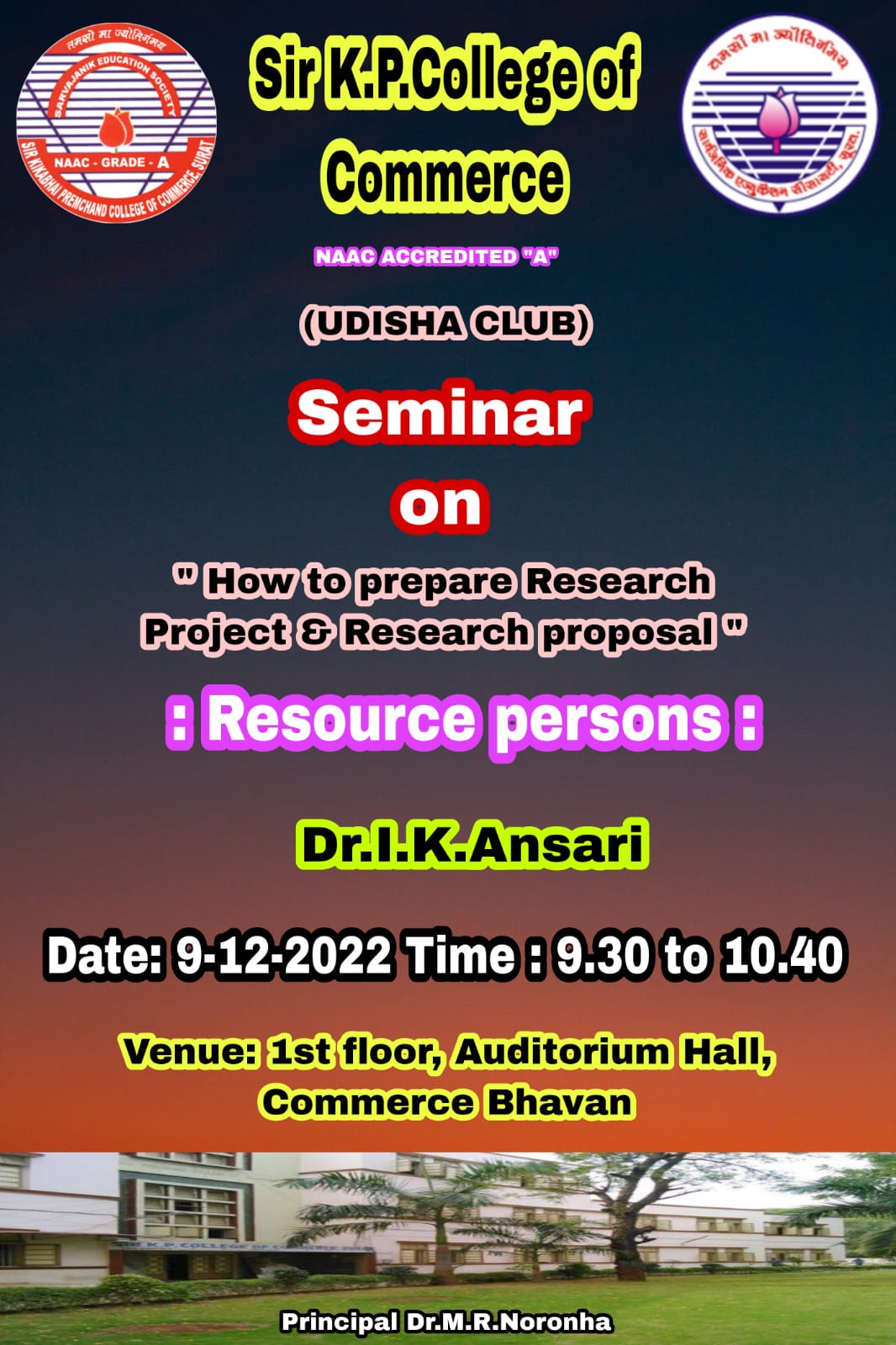 સર કે પી કોલેજ ઓફ કોમર્સ ઉદીશા ક્લબ અને રીસર્ચ કમિટીના સયુંકત ઉપક્રમે આવતીકાલે શુક્રવારે તારીખ 9 ડિસેમ્બર 2022 ના રોજ “How to prepare Research Project & Research Proposal” વિષય પર ખાસ એમ.કોમના વિદ્યાર્થીઓ માટે એક દિવસીય સેમીનારનું કોમર્સ ભવન પહેલા માળે, ઓડિટોરિયમ હોલ ખાતે 9.30 વાગે આયોજન કરવામાં આવેલ છે. એમ.કોમના તમામ વિદ્યાર્થીઓએ સમયસર 09:20 વાગે સેમિનારમાં ફરજીયાત હાજર રહેવું. સેમિનારમાં હાજરી લેવામાં આવશે.