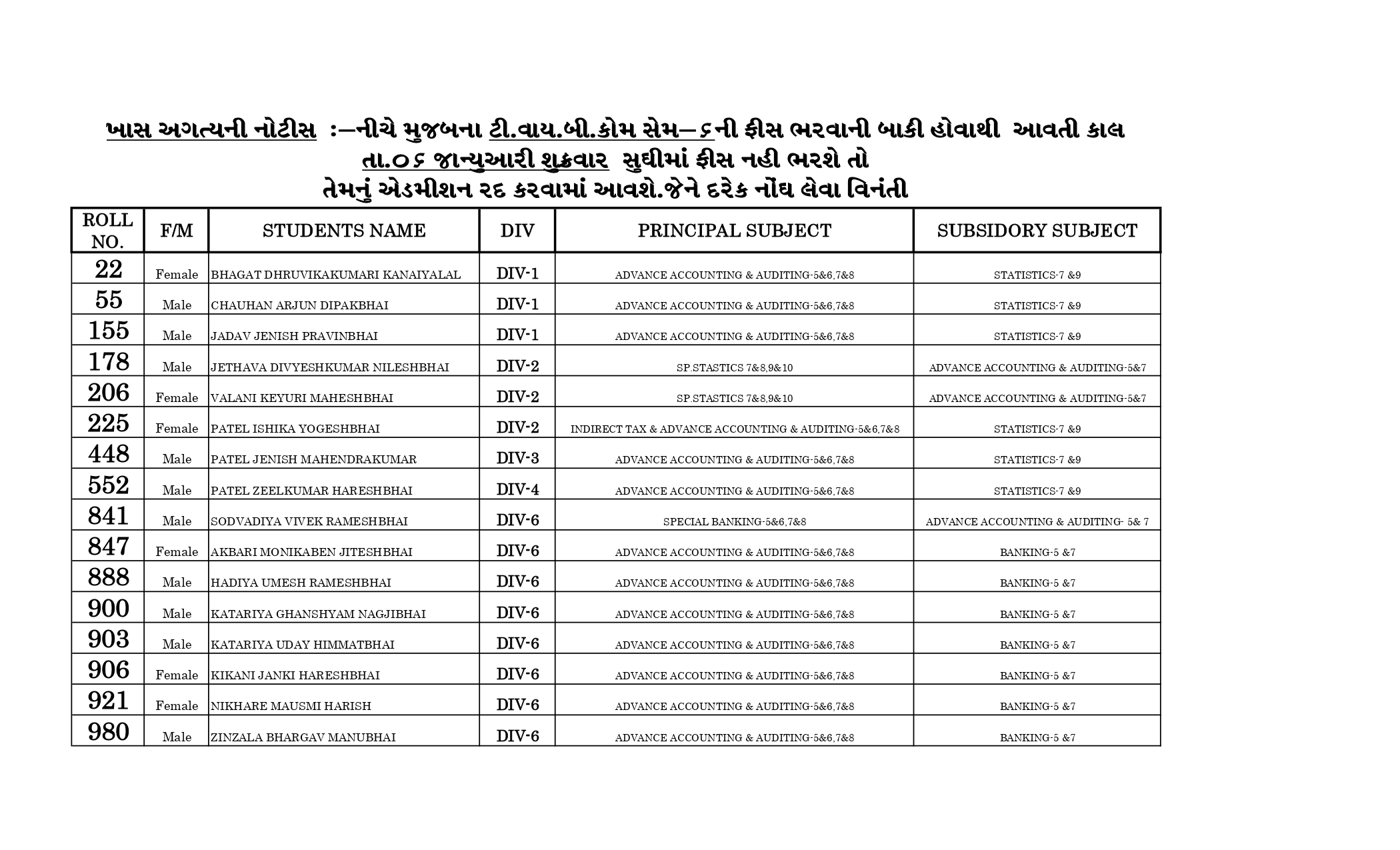 T.Y.B.COM. SEM-VI ના ફી બાકી વિદ્યાર્થી ની યાદી.