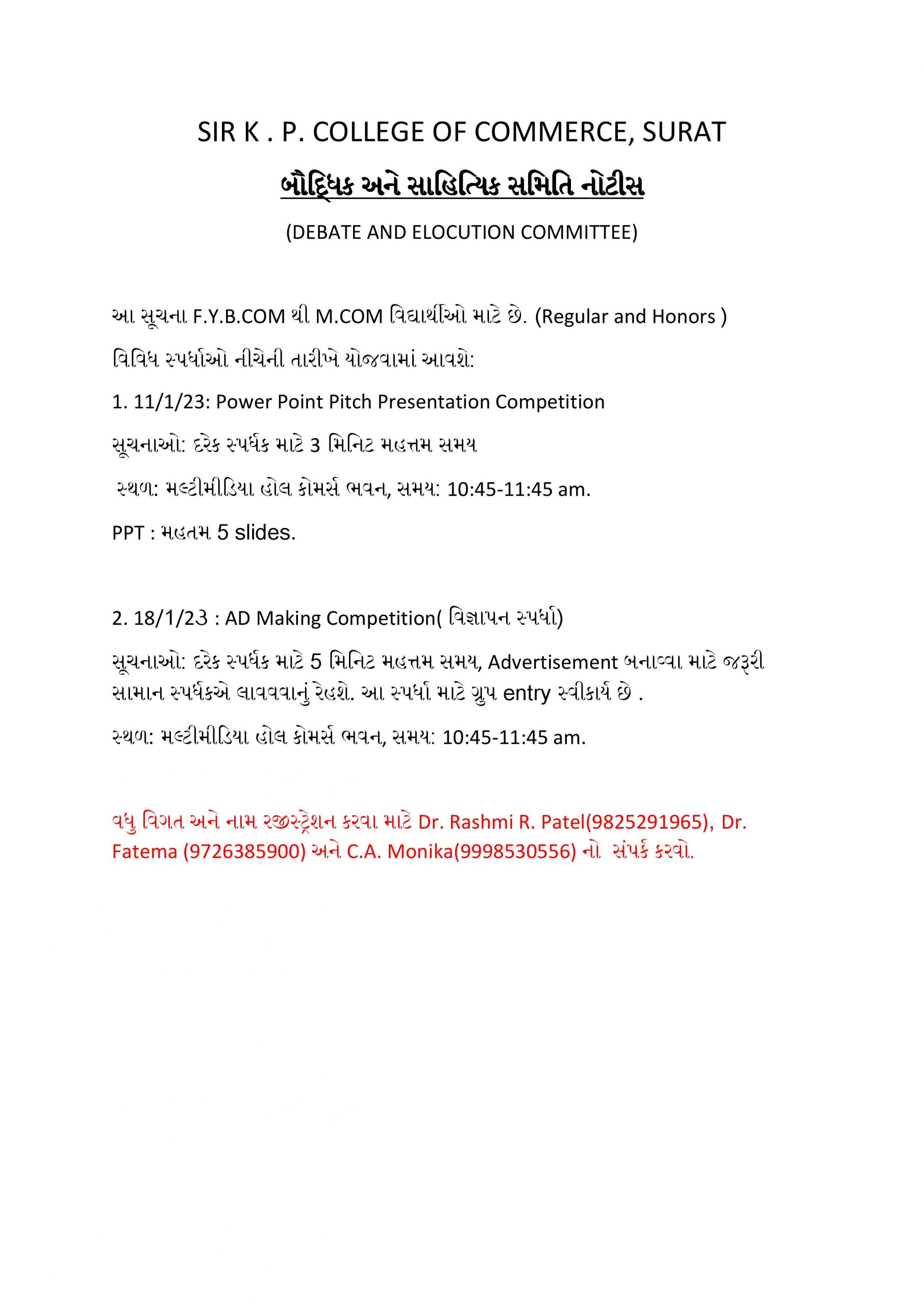 બૌદ્ધિક અને સાહિત્યિક સમિતિ નોટીસ (DEBATE AND ELOCUTION COMMITTEE) વિવિધ સ્પર્ધાઓ નીચેની તારીખે યોજવામાં આવશે: Jan 7, 2023