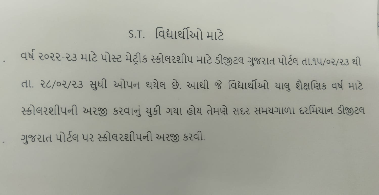 ST વિદ્યાર્થીઓ માટે Feb 15, 2023 અગાઉ કોઈ વિદ્યાર્થી નું ફોર્મ કોલેજમાં જમા નથી કરાવ્યું તોએ ફોર્મ જમા કરવી જવા.