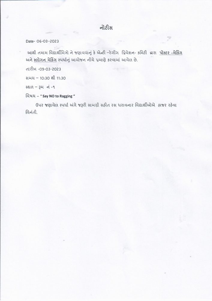 એન્ટી- રેગિંગ પ્રિવેશન – કમિટી દ્વારા પોસ્ટર – મેકિંગ અને સ્લોગન મેકિંગ સ્પર્ધા 2023