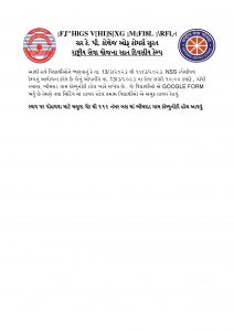 આથી સર્વ વિદ્યાર્થીઓને જાણવાનું કે તા. 13/૩/૨૦૨૩ થી ૧૯/૩/૨૦૨૩ NSS સ્પેશીયલ કેમ્પનું આયોજન કરેલ છે જેનું ઓપનીંગ તા. 13/૩/૨૦૨૩ ના રોજ સવારે ૧૦:૦૦ કલાકે , ગાંધી સ્મારક, ભીમરાડ ગામ કોમ્યુનીટી હોલ ખાતે રાખેલ છે . જે વિદ્યાર્થીઓ એ GOOGLE FORM ભર્યું છે તેમણે તથા મિટિંગ માં હાજર રહેલ તમામ વિદ્યાર્થીઓ એ અચૂક હાજર રેહવું. સ્થળ પર પોહચવા માટે મજુરા ગેટ થી ૧૧૬ નંબર બસ માં ભીમરાડ ગામ કોમ્યુનીટી હોલ આવવું
