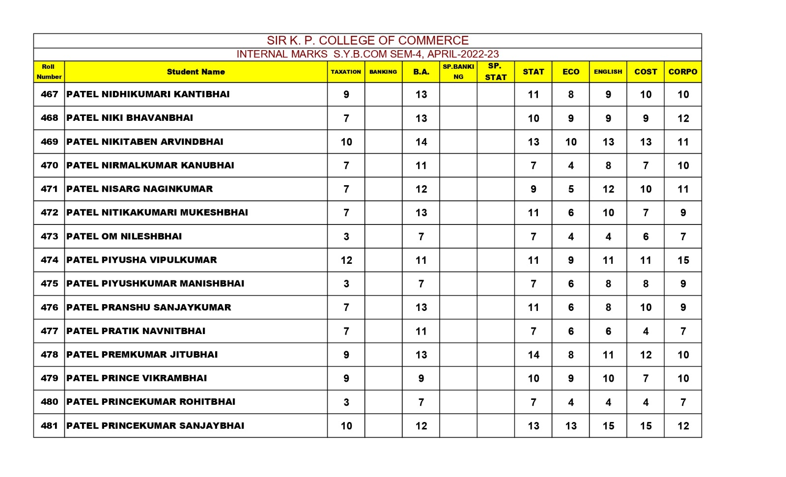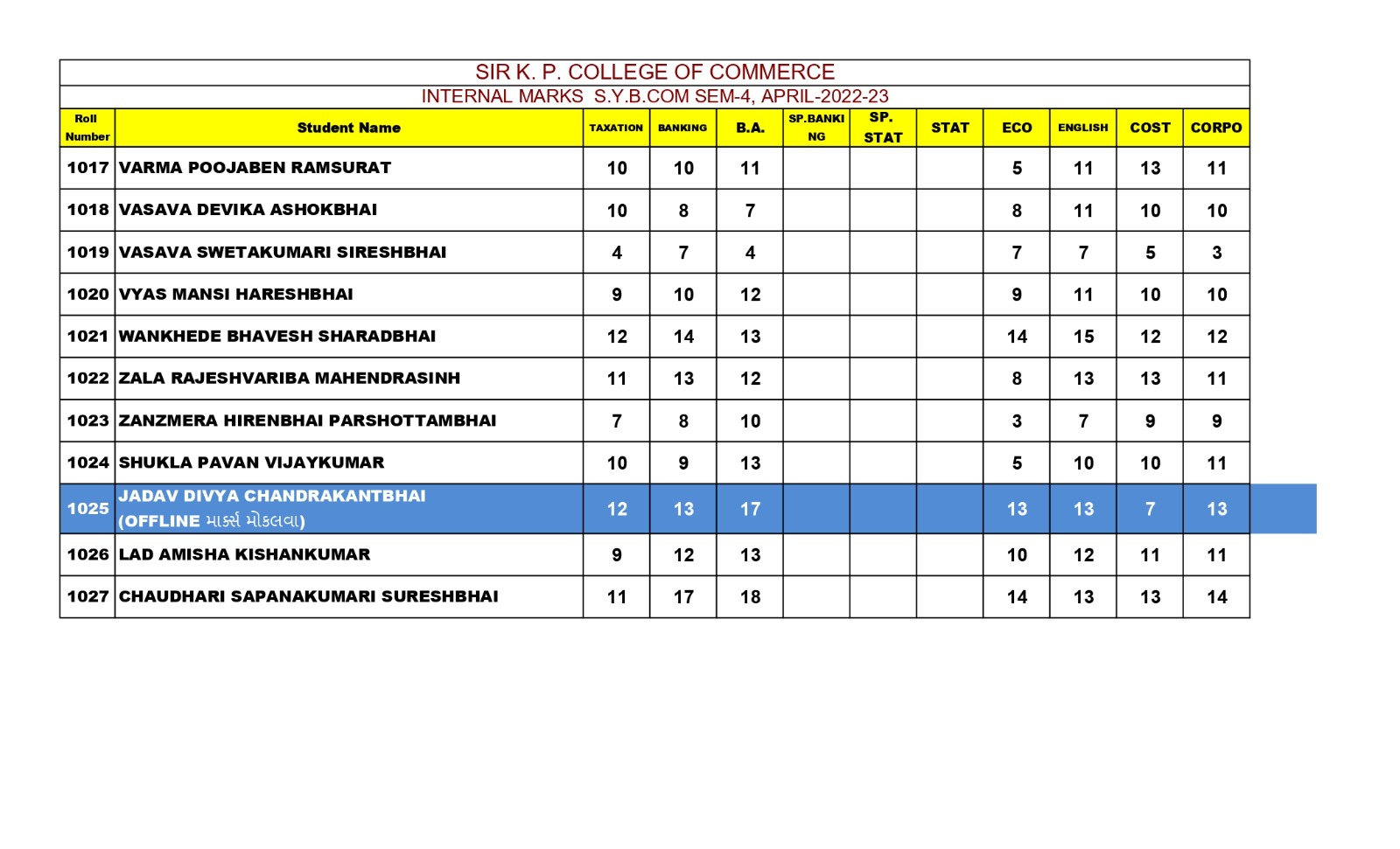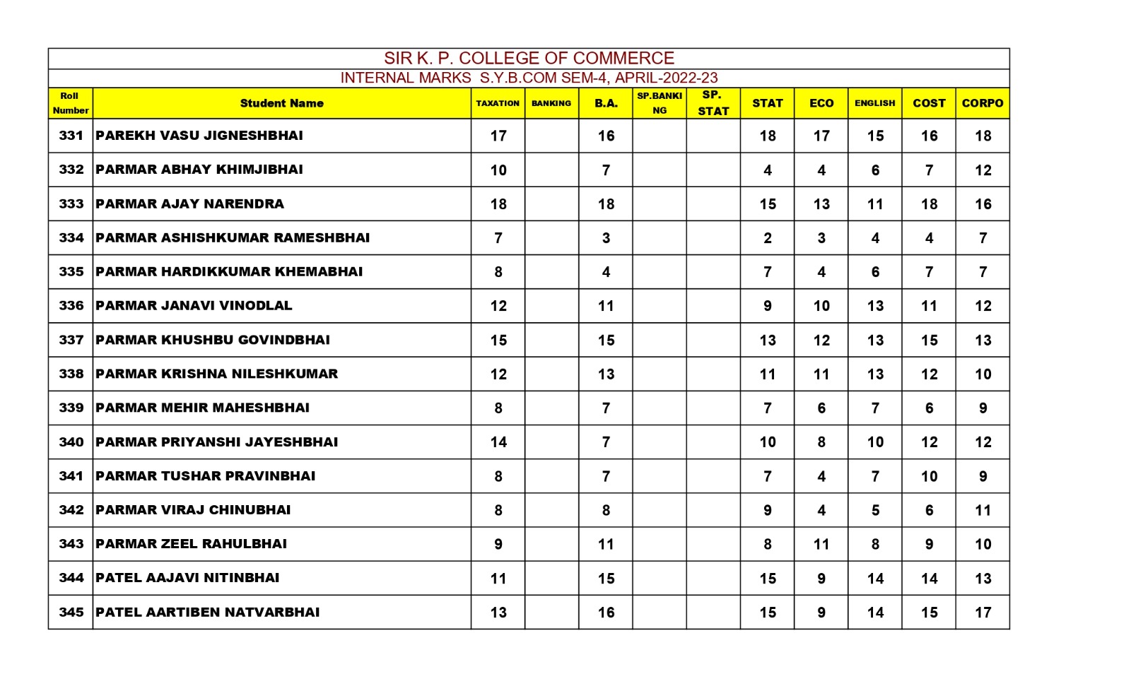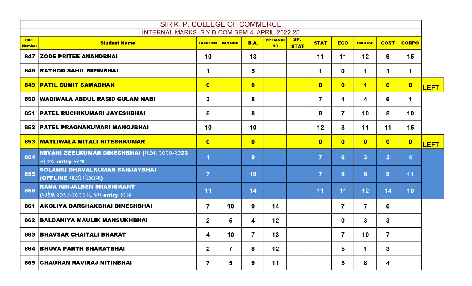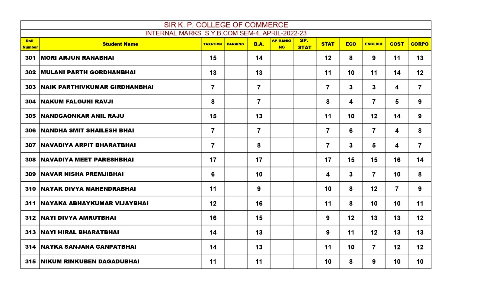એસ.વાય.બી.કોમ સેમ -૪ નાં INTERNAL MARK નીચે મુજબ વિદ્યાર્થીઓના વિષય પ્રમાણે PDF આપેલ છે. વિદ્યાર્થીઓને Internal Mark બાબતે કોઈ પ્રશ્ન હોય તો તા.૩૧ માર્ચ ૨૦૨૩ શુક્રવાર સવારે ૧૧ થી ૨ બપોર ૨ વાગ્યા સુધીમાં ફરજીયાત રૂબરૂ આવીને કોલેજમાં મળી જવું શુક્રવાર બાદ કોઈ પણ રજુઆત ગાહ્યા રાખવામા આવશે નહી જેની દરેક વિધાર્થીઓએ નોંધ લેવી.