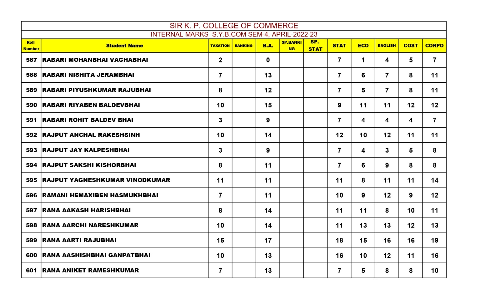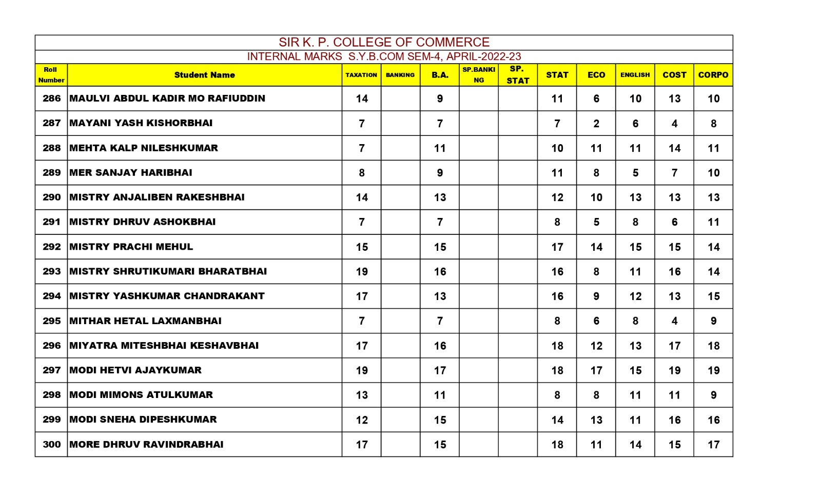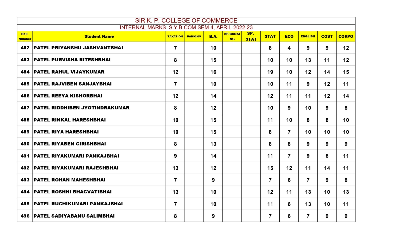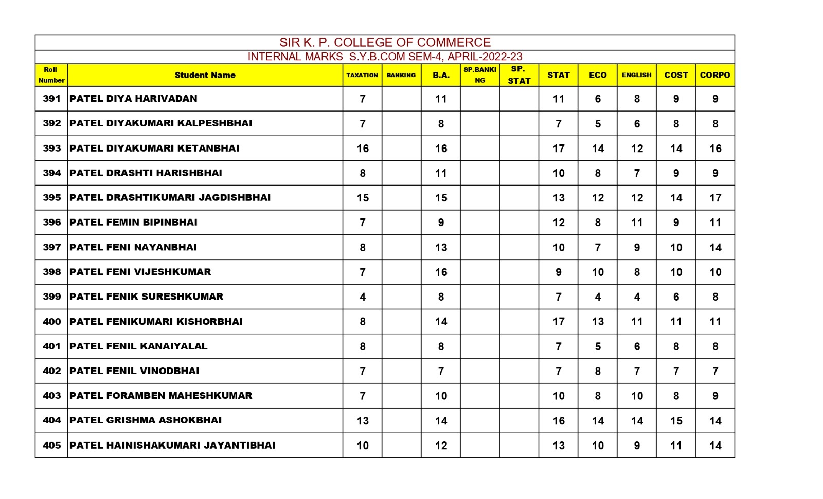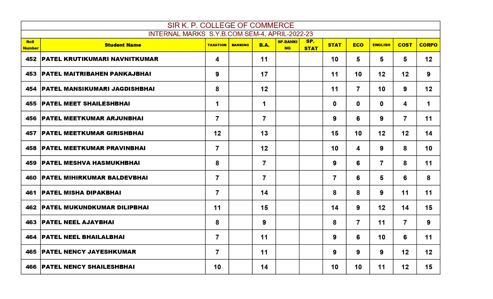 એસ.વાય.બી.કોમ સેમ -૪ નાં INTERNAL MARK નીચે મુજબ વિદ્યાર્થીઓના વિષય પ્રમાણે PDF આપેલ છે. વિદ્યાર્થીઓને Internal Mark બાબતે કોઈ પ્રશ્ન હોય તો તા.૩૧ માર્ચ ૨૦૨૩ શુક્રવાર સવારે ૧૧ થી ૨ બપોર ૨ વાગ્યા સુધીમાં ફરજીયાત રૂબરૂ આવીને કોલેજમાં મળી જવું શુક્રવાર બાદ કોઈ પણ રજુઆત ગાહ્યા રાખવામા આવશે નહી જેની દરેક વિધાર્થીઓએ નોંધ લેવી.