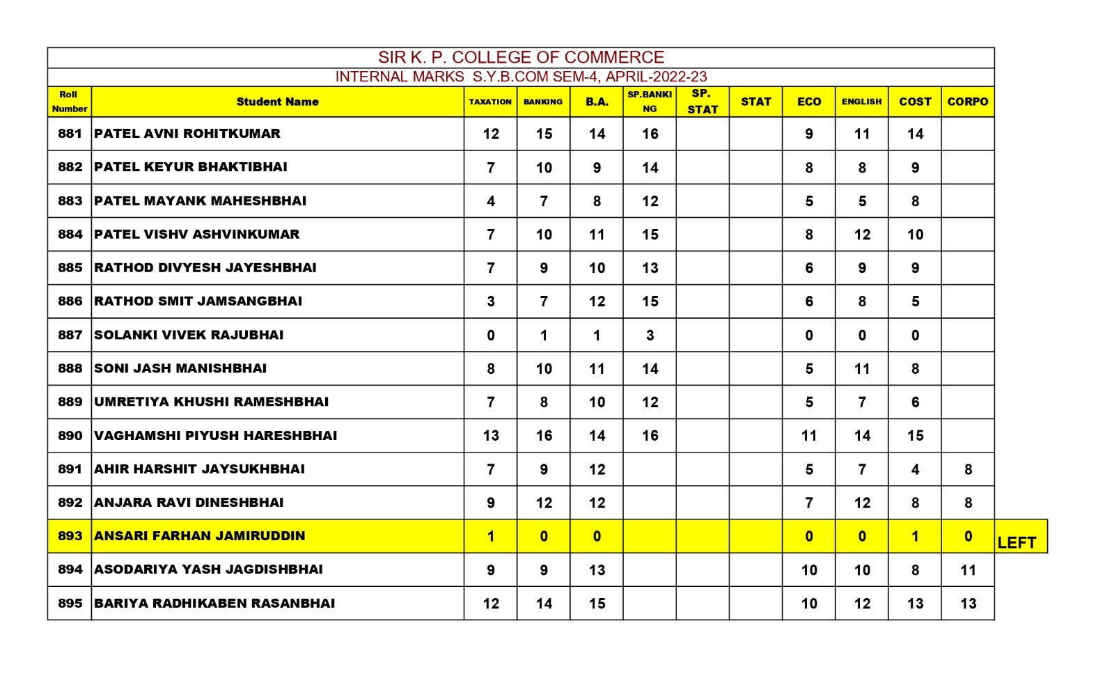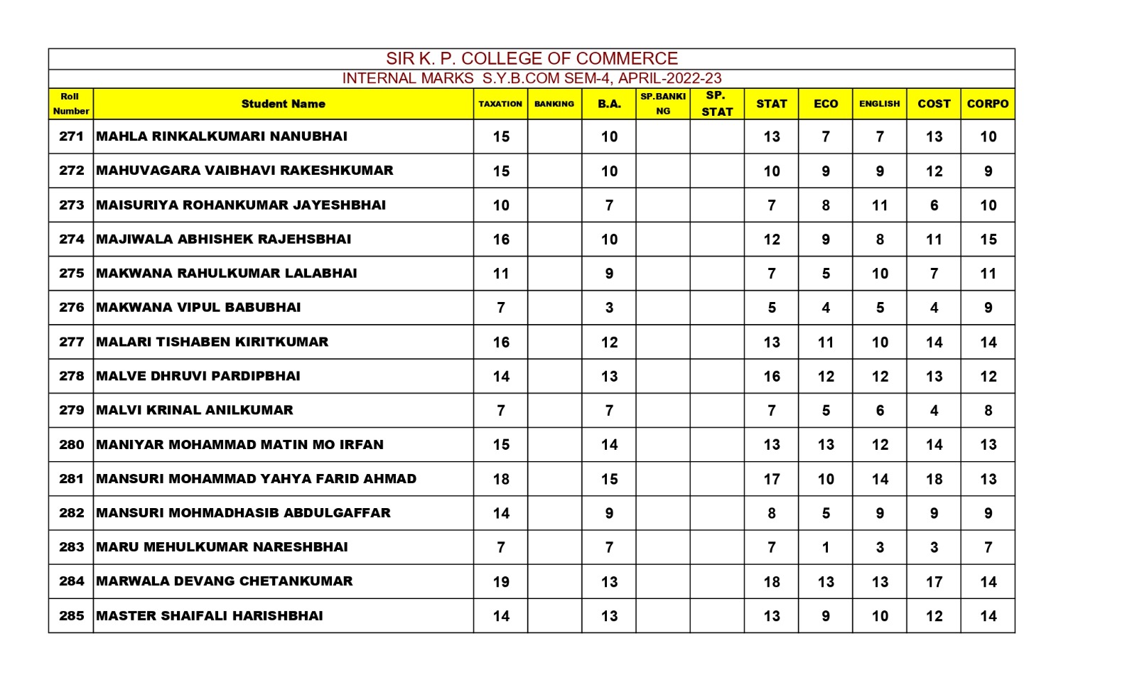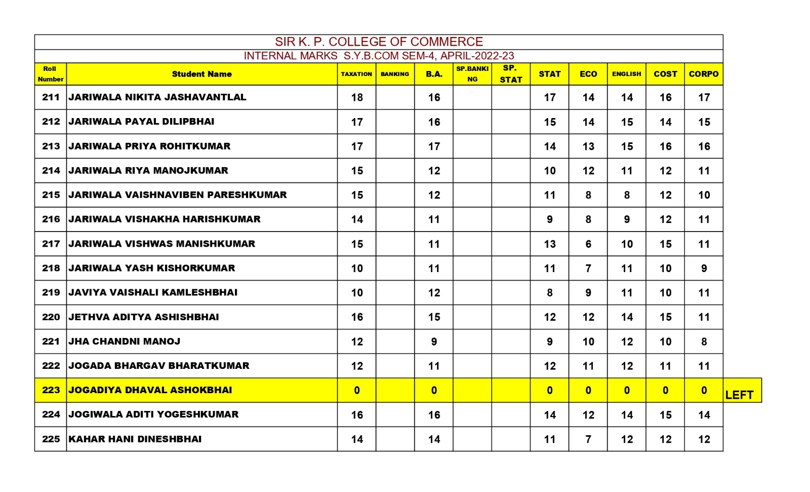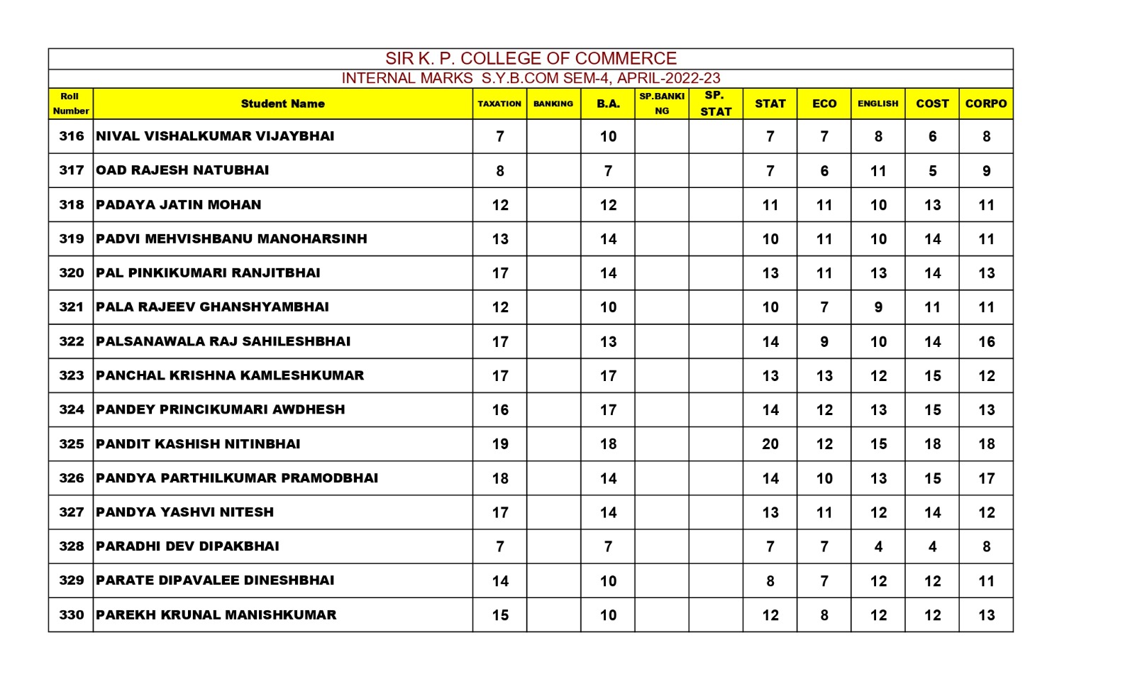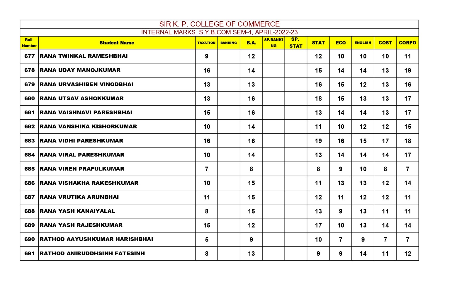 એસ.વાય.બી.કોમ સેમ -૪ નાં INTERNAL MARK નીચે મુજબ વિદ્યાર્થીઓના વિષય પ્રમાણે PDF આપેલ છે. વિદ્યાર્થીઓને Internal Mark બાબતે કોઈ પ્રશ્ન હોય તો તા.૩૧ માર્ચ ૨૦૨૩ શુક્રવાર સવારે ૧૧ થી ૨ બપોર ૨ વાગ્યા સુધીમાં ફરજીયાત રૂબરૂ આવીને કોલેજમાં મળી જવું શુક્રવાર બાદ કોઈ પણ રજુઆત ગાહ્યા રાખવામા આવશે નહી જેની દરેક વિધાર્થીઓએ નોંધ લેવી.