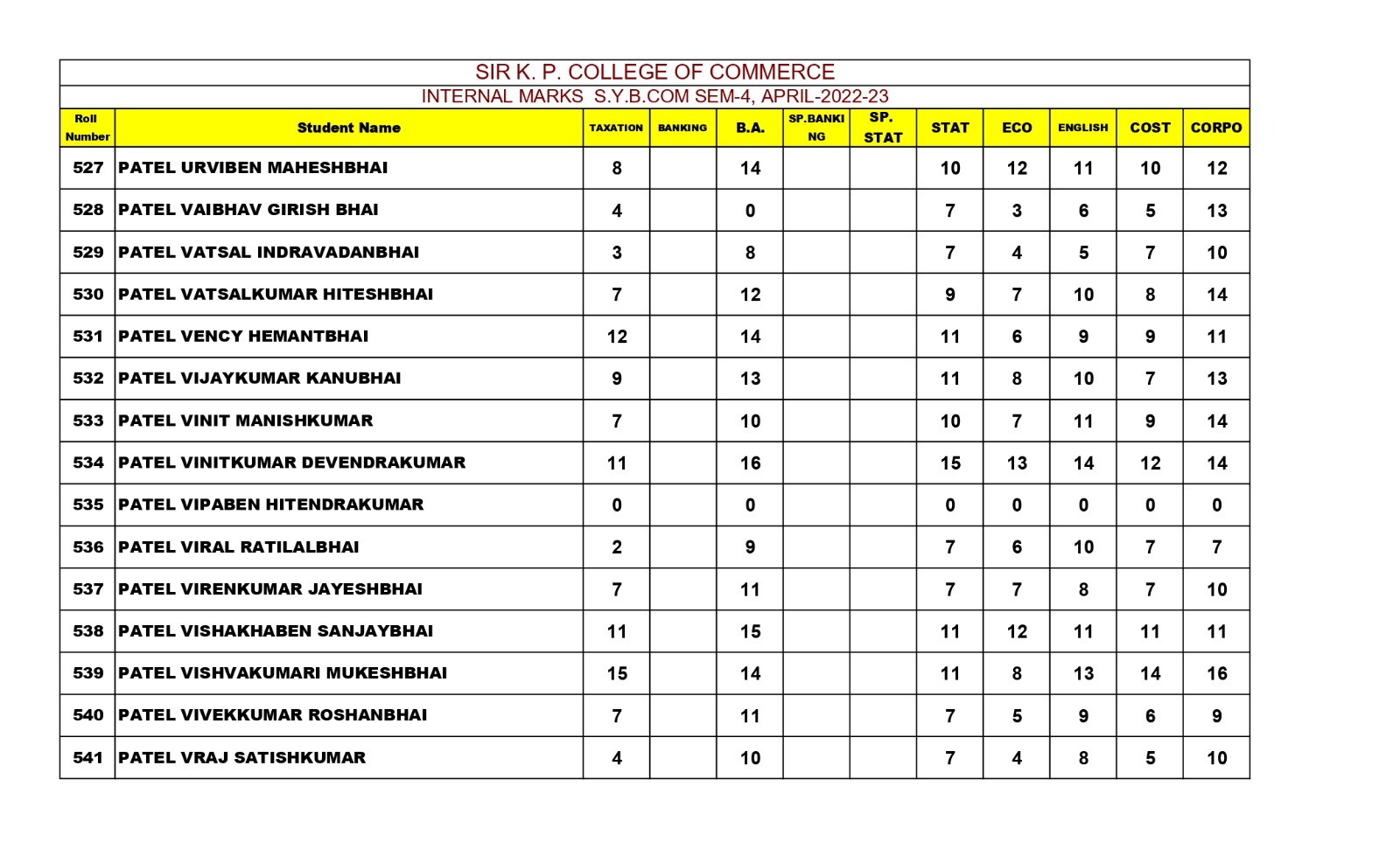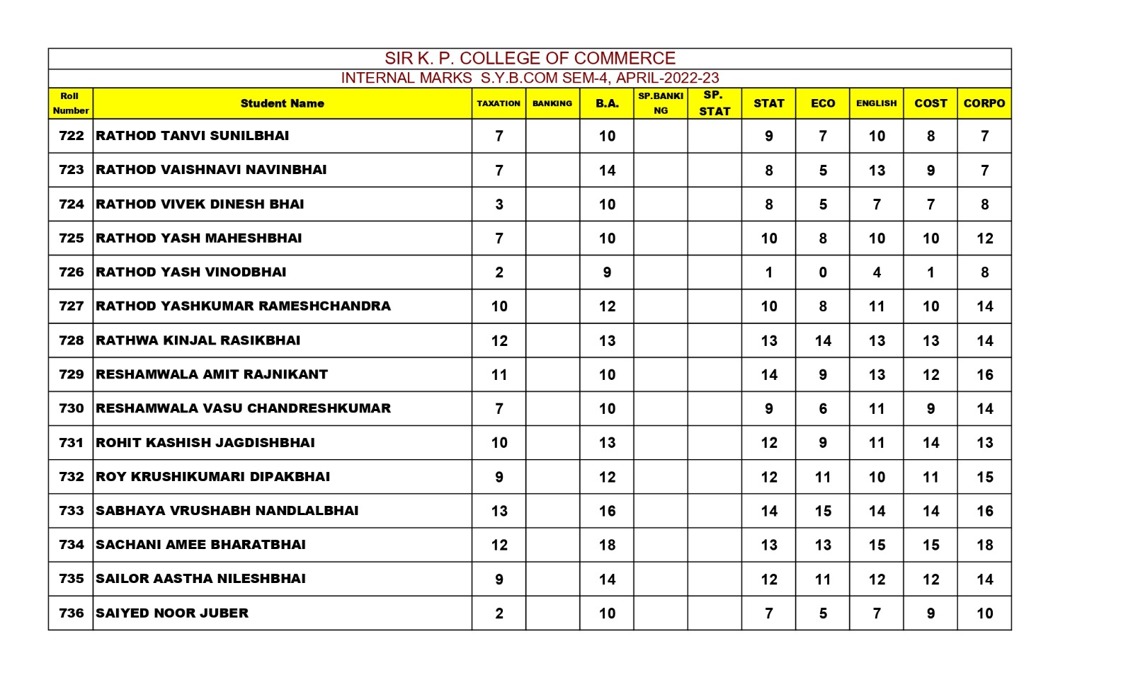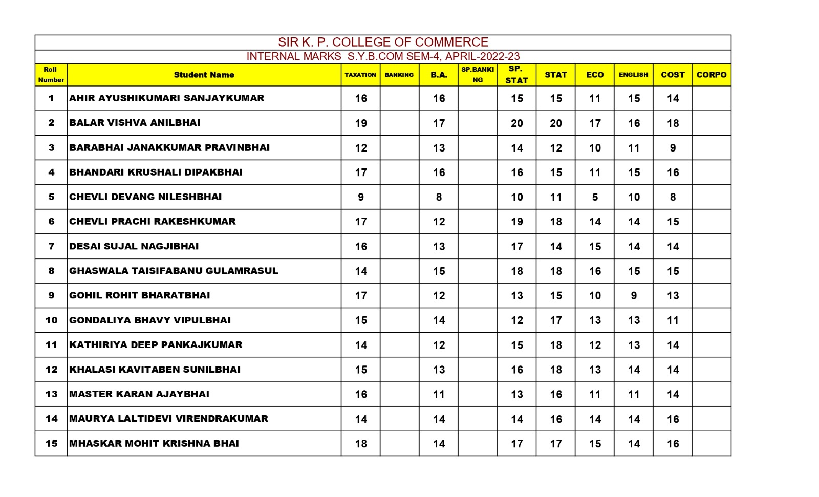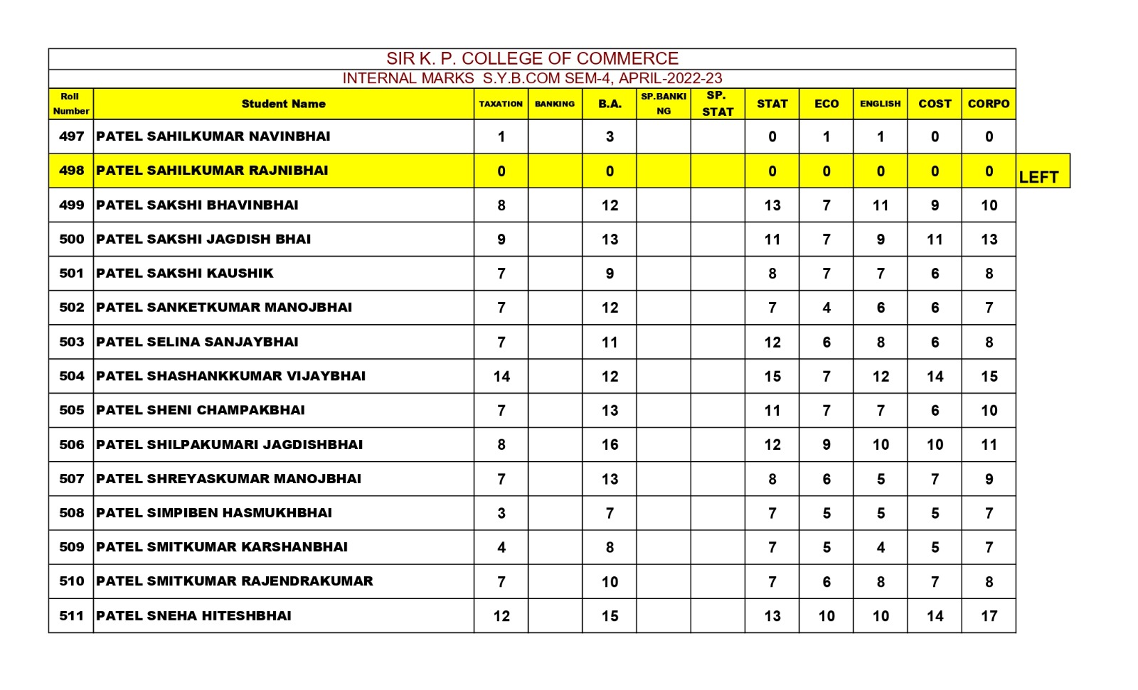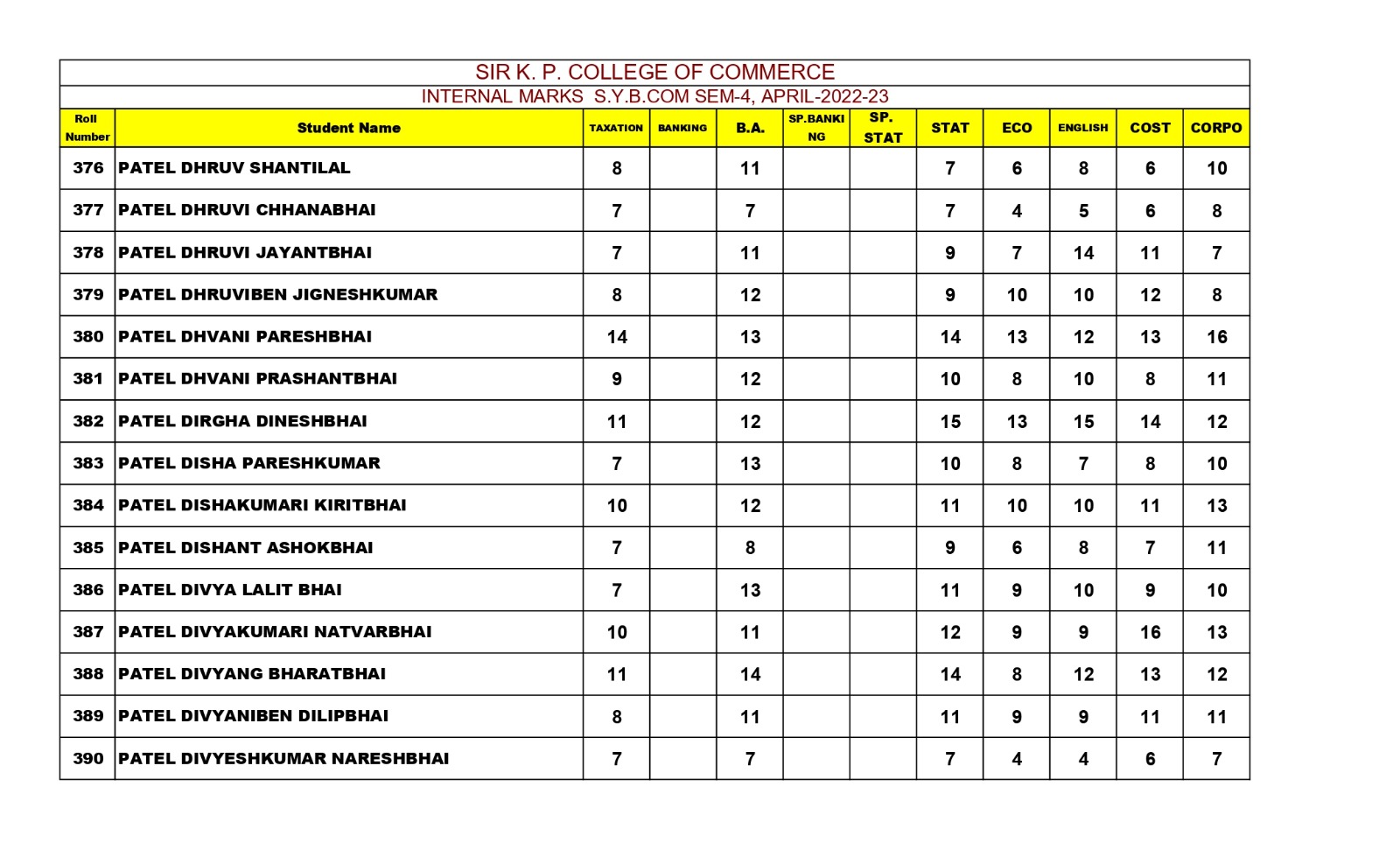 એસ.વાય.બી.કોમ સેમ -૪ નાં INTERNAL MARK નીચે મુજબ વિદ્યાર્થીઓના વિષય પ્રમાણે PDF આપેલ છે. વિદ્યાર્થીઓને Internal Mark બાબતે કોઈ પ્રશ્ન હોય તો તા.૩૧ માર્ચ ૨૦૨૩ શુક્રવાર સવારે ૧૧ થી ૨ બપોર ૨ વાગ્યા સુધીમાં ફરજીયાત રૂબરૂ આવીને કોલેજમાં મળી જવું શુક્રવાર બાદ કોઈ પણ રજુઆત ગાહ્યા રાખવામા આવશે નહી જેની દરેક વિધાર્થીઓએ નોંધ લેવી.