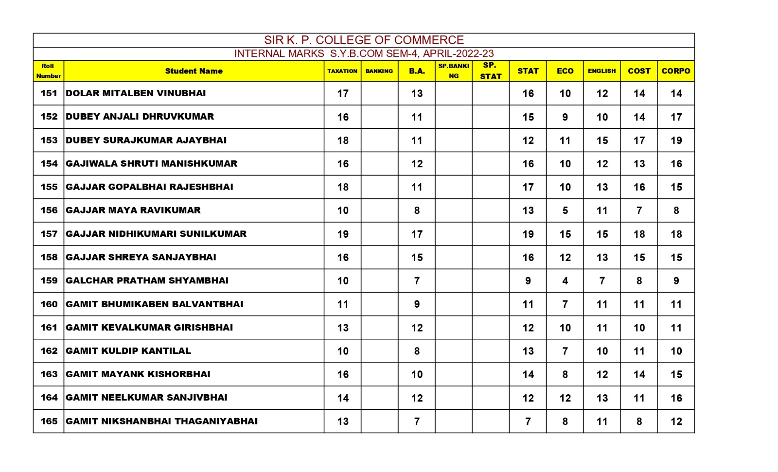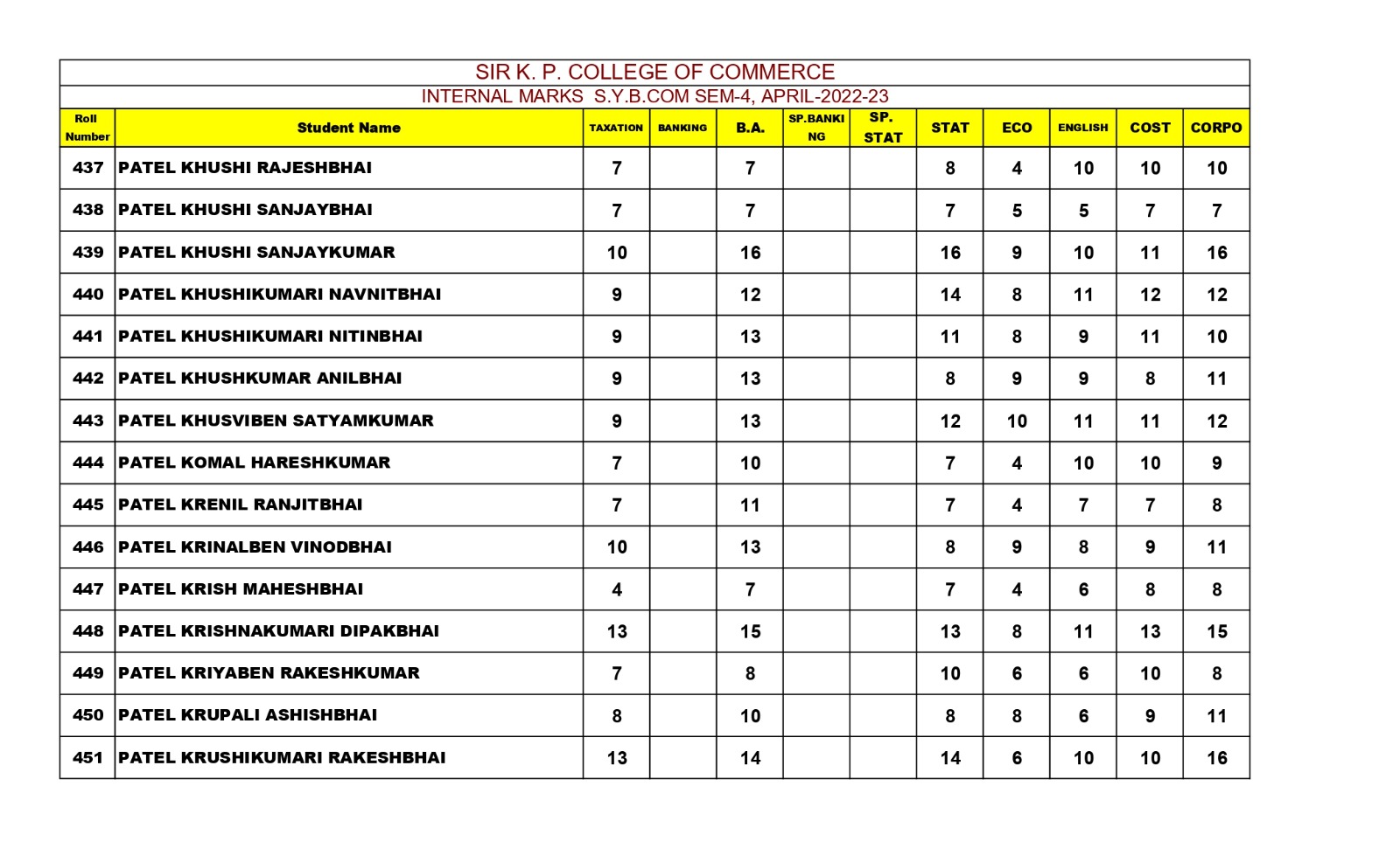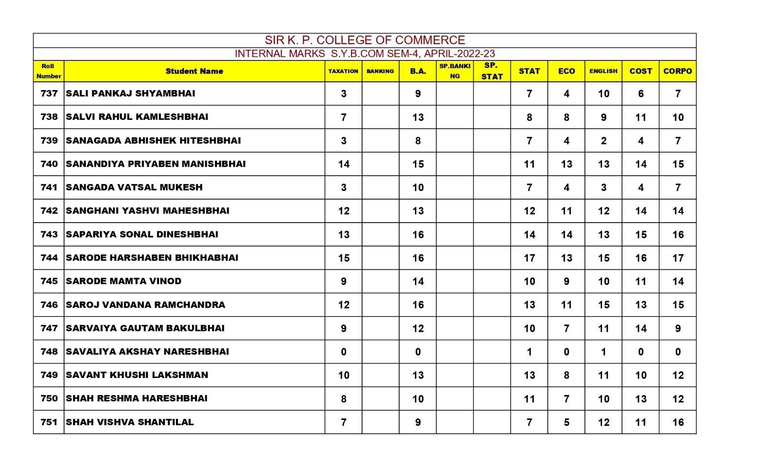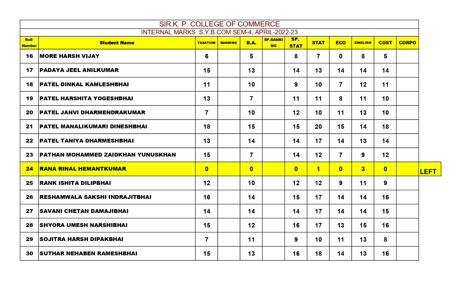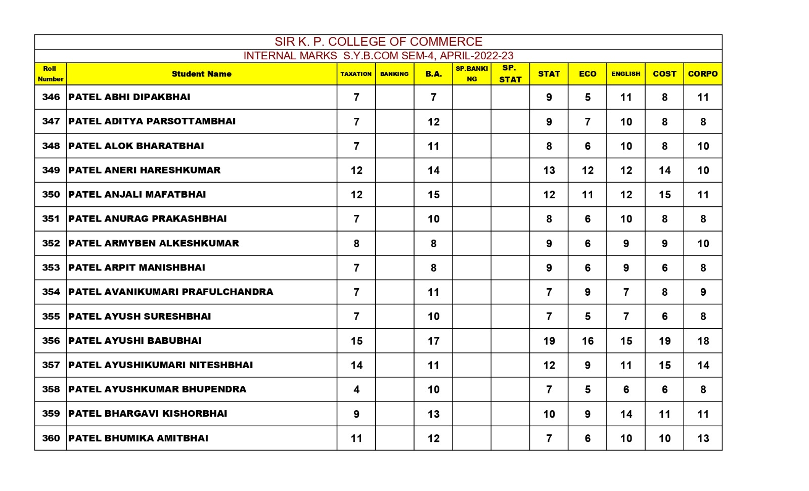 એસ.વાય.બી.કોમ સેમ -૪ નાં INTERNAL MARK નીચે મુજબ વિદ્યાર્થીઓના વિષય પ્રમાણે PDF આપેલ છે. વિદ્યાર્થીઓને Internal Mark બાબતે કોઈ પ્રશ્ન હોય તો તા.૩૧ માર્ચ ૨૦૨૩ શુક્રવાર સવારે ૧૧ થી ૨ બપોર ૨ વાગ્યા સુધીમાં ફરજીયાત રૂબરૂ આવીને કોલેજમાં મળી જવું શુક્રવાર બાદ કોઈ પણ રજુઆત ગાહ્યા રાખવામા આવશે નહી જેની દરેક વિધાર્થીઓએ નોંધ લેવી.