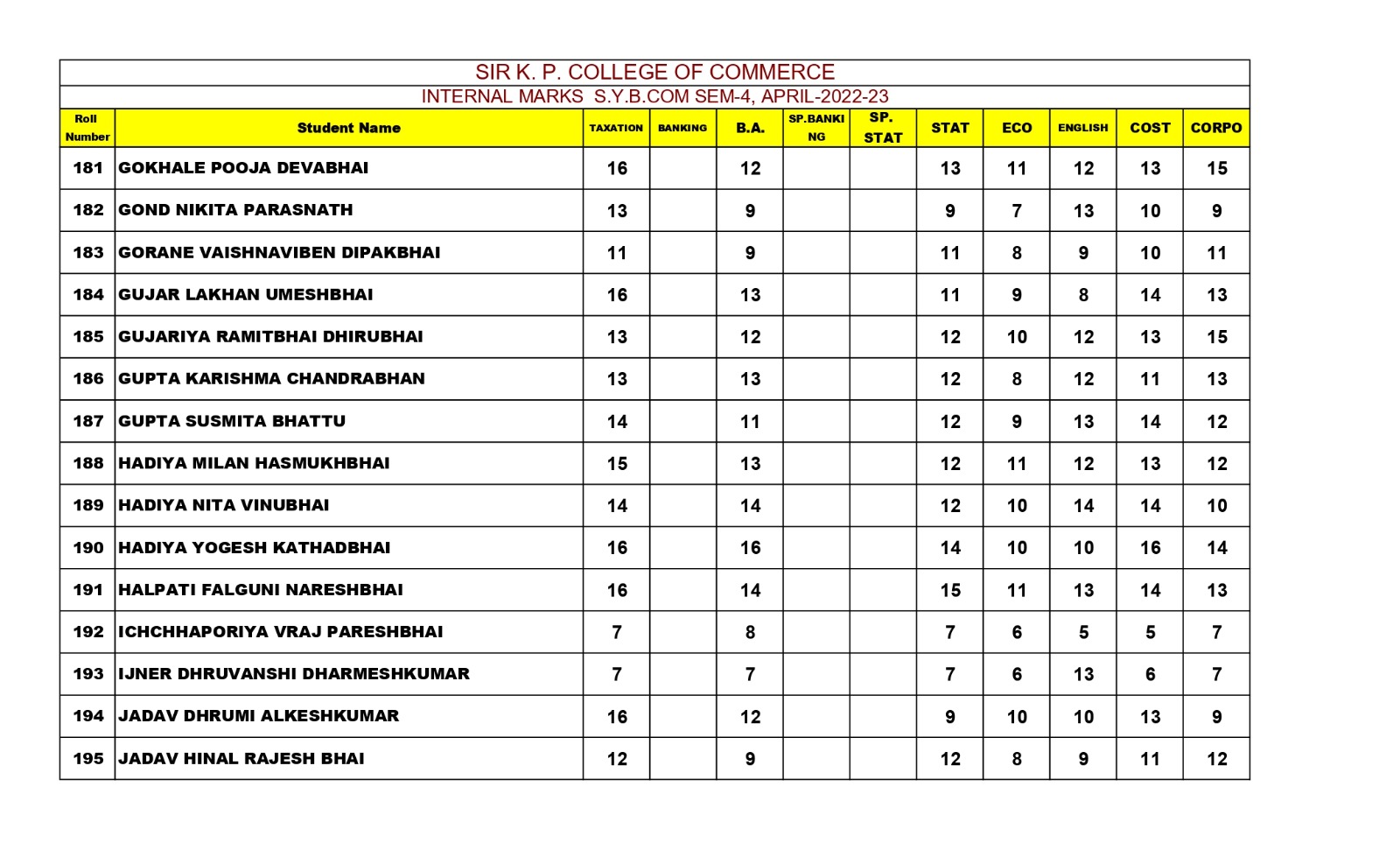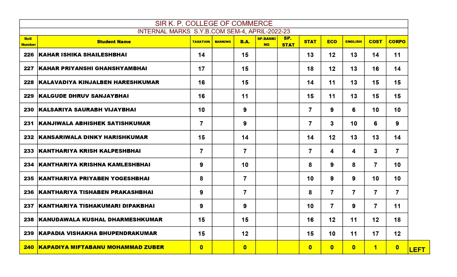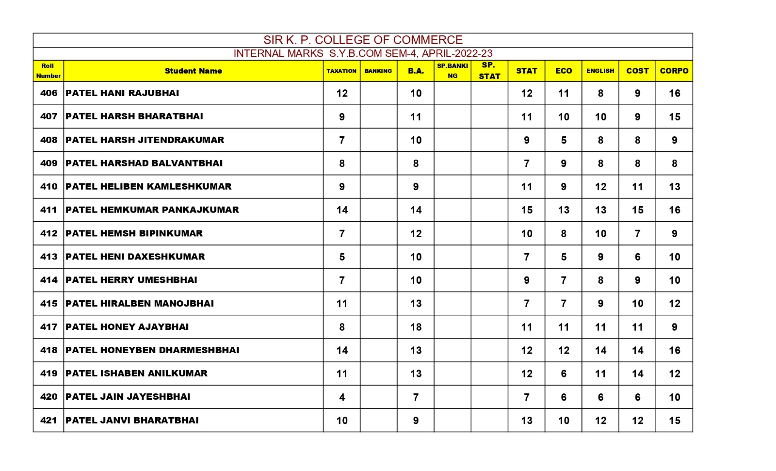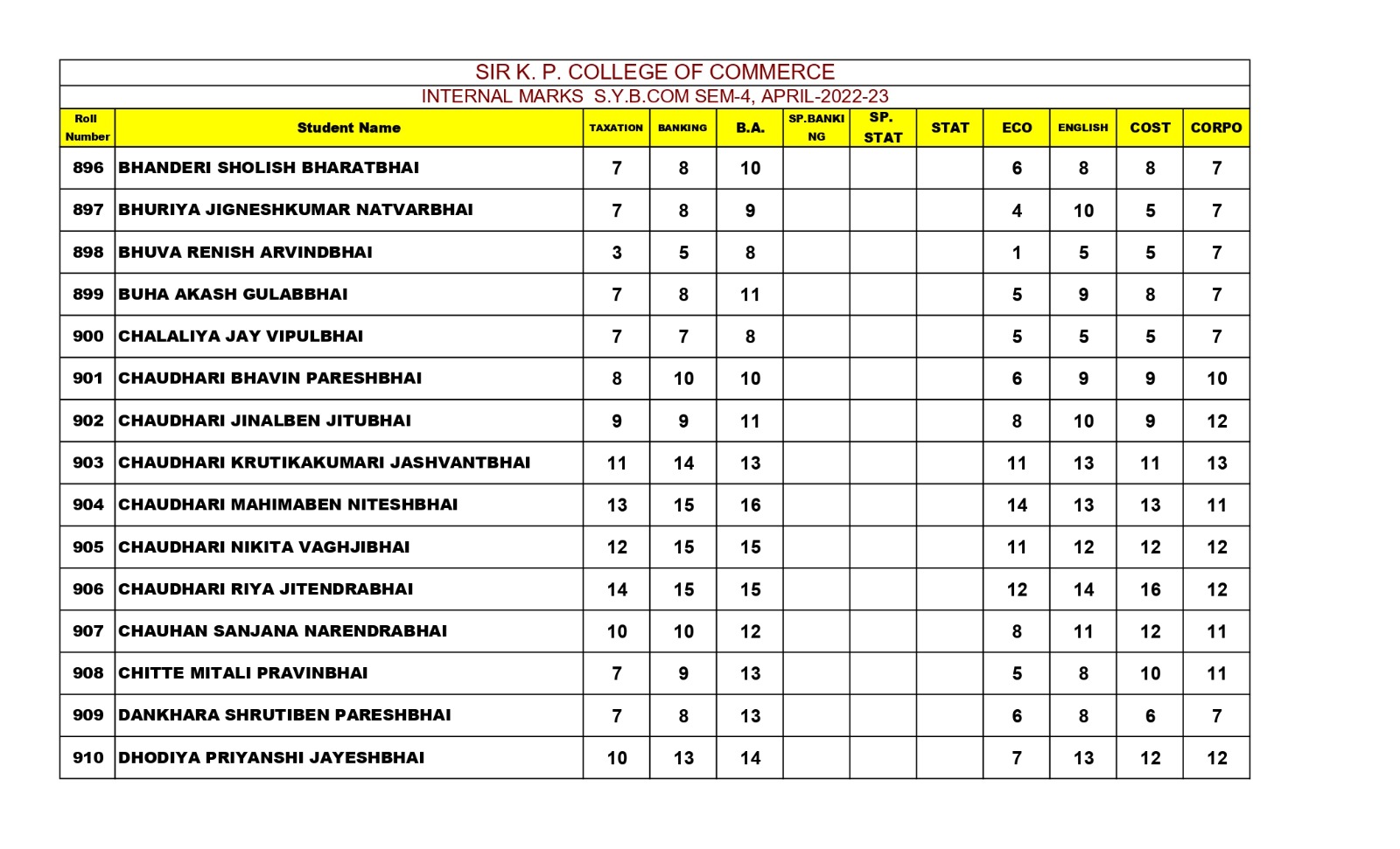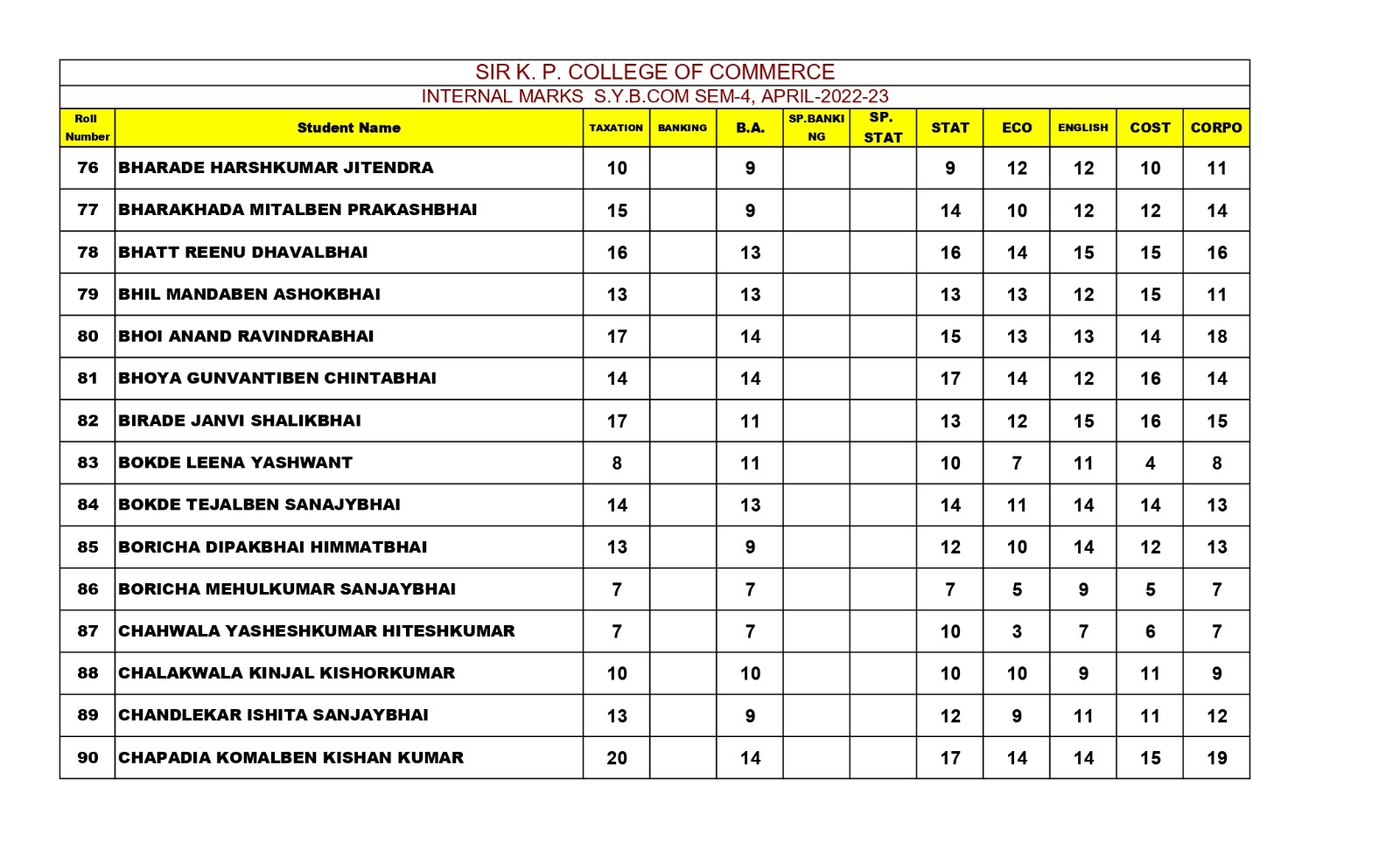 એસ.વાય.બી.કોમ સેમ -૪ નાં INTERNAL MARK નીચે મુજબ વિદ્યાર્થીઓના વિષય પ્રમાણે PDF આપેલ છે. વિદ્યાર્થીઓને Internal Mark બાબતે કોઈ પ્રશ્ન હોય તો તા.૩૧ માર્ચ ૨૦૨૩ શુક્રવાર સવારે ૧૧ થી ૨ બપોર ૨ વાગ્યા સુધીમાં ફરજીયાત રૂબરૂ આવીને કોલેજમાં મળી જવું શુક્રવાર બાદ કોઈ પણ રજુઆત ગાહ્યા રાખવામા આવશે નહી જેની દરેક વિધાર્થીઓએ નોંધ લેવી.