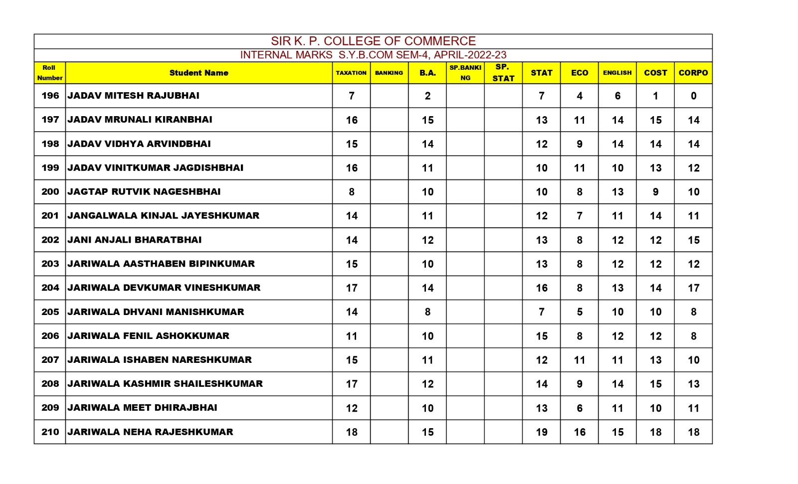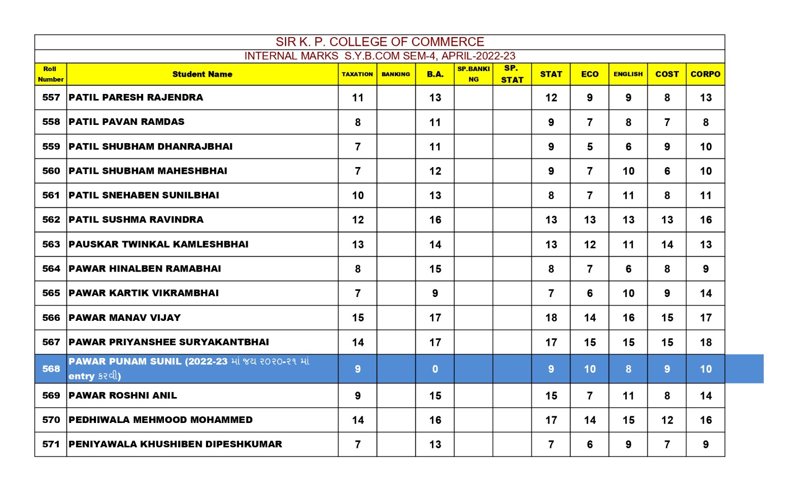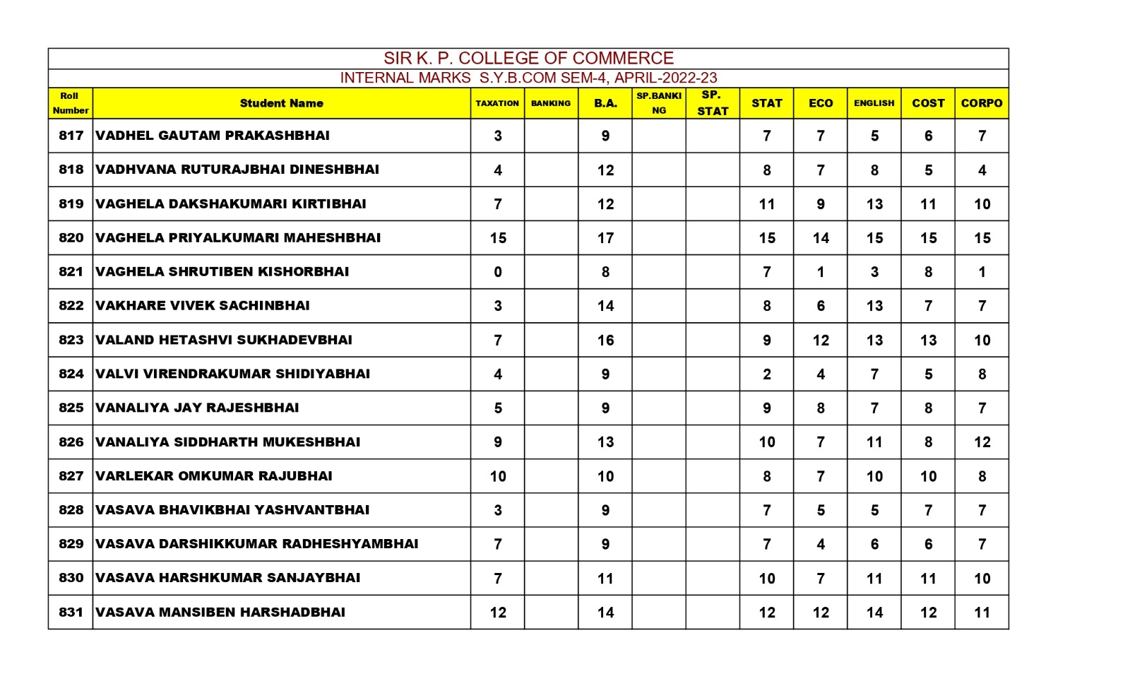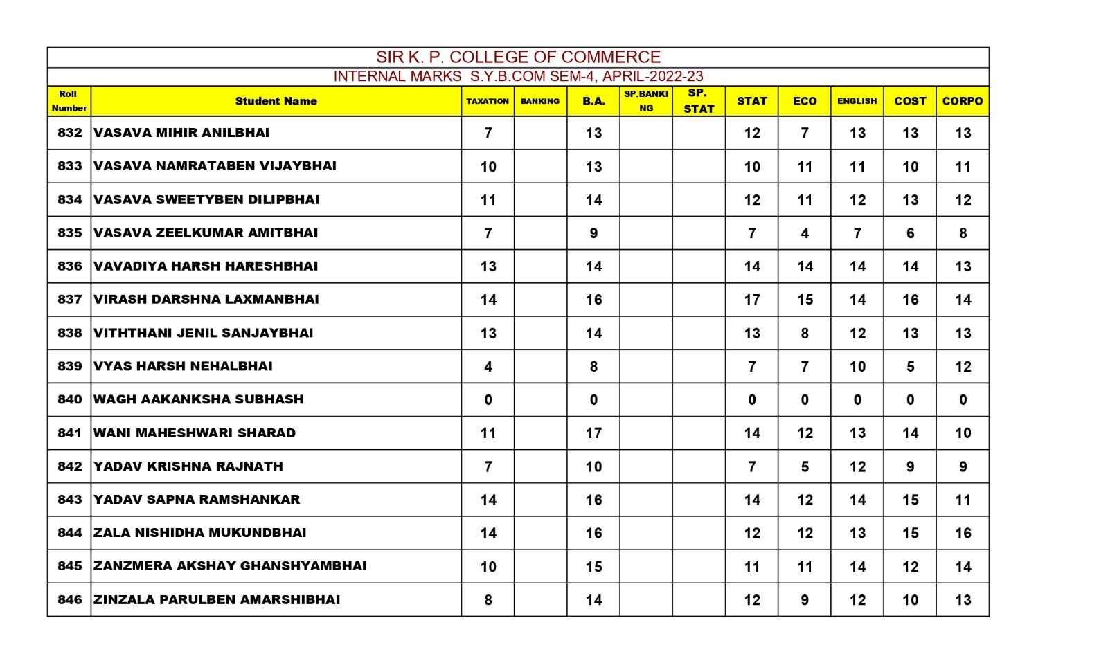 એસ.વાય.બી.કોમ સેમ -૪ નાં INTERNAL MARK નીચે મુજબ વિદ્યાર્થીઓના વિષય પ્રમાણે PDF આપેલ છે. વિદ્યાર્થીઓને Internal Mark બાબતે કોઈ પ્રશ્ન હોય તો તા.૩૧ માર્ચ ૨૦૨૩ શુક્રવાર સવારે ૧૧ થી ૨ બપોર ૨ વાગ્યા સુધીમાં ફરજીયાત રૂબરૂ આવીને કોલેજમાં મળી જવું શુક્રવાર બાદ કોઈ પણ રજુઆત ગાહ્યા રાખવામા આવશે નહી જેની દરેક વિધાર્થીઓએ નોંધ લેવી.