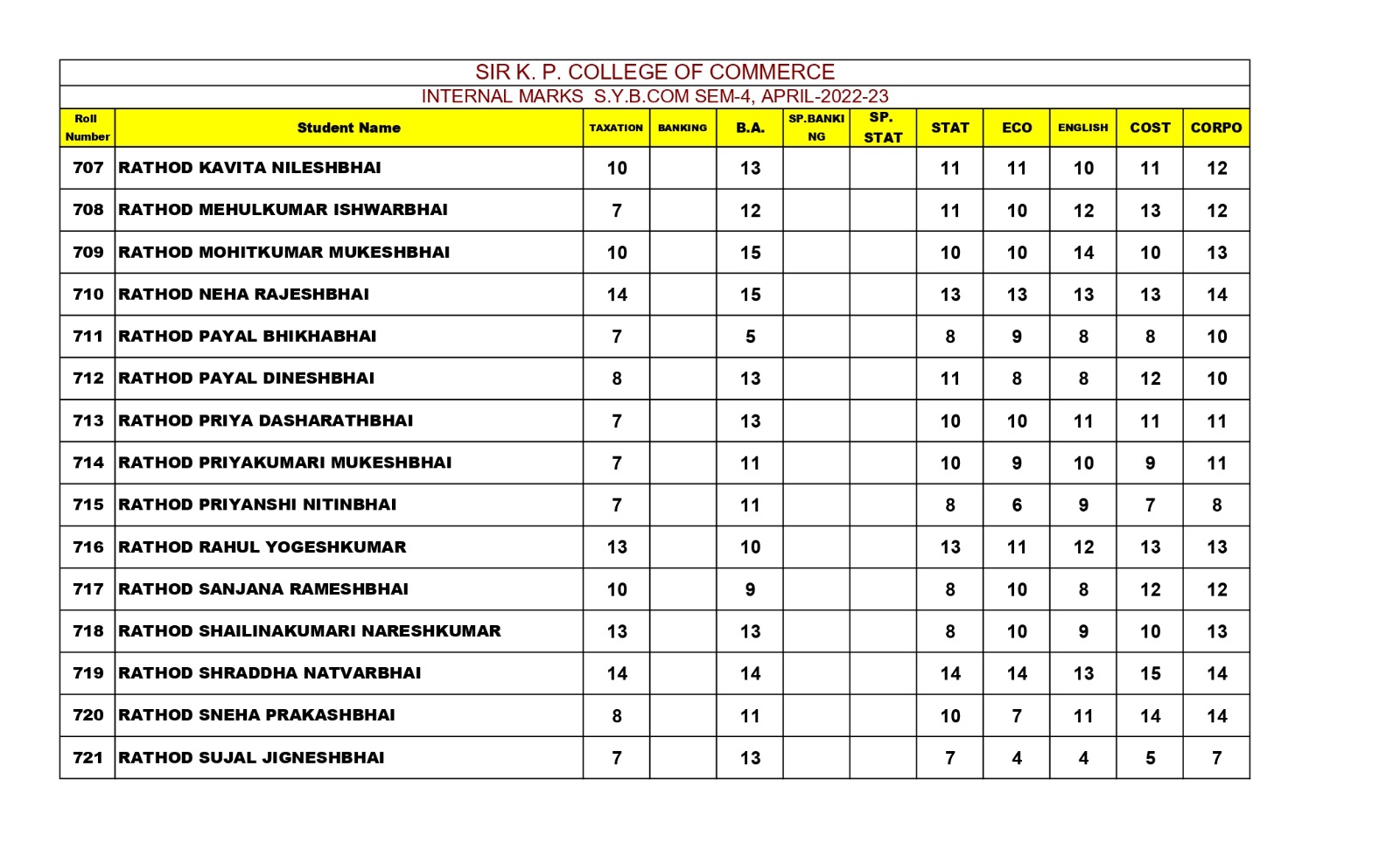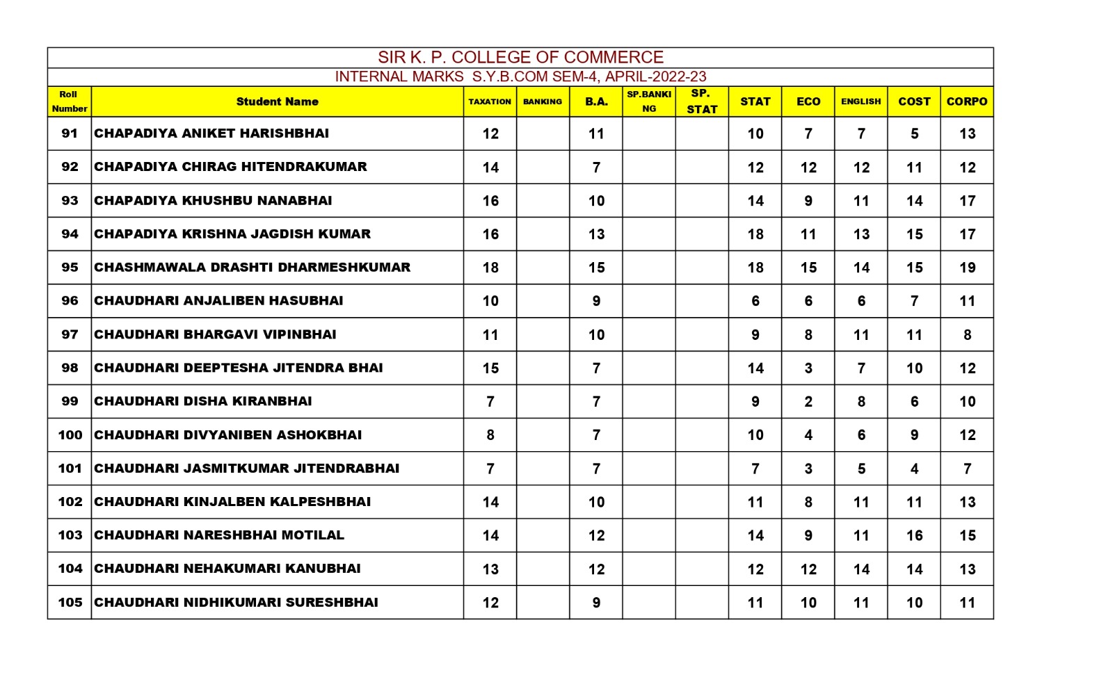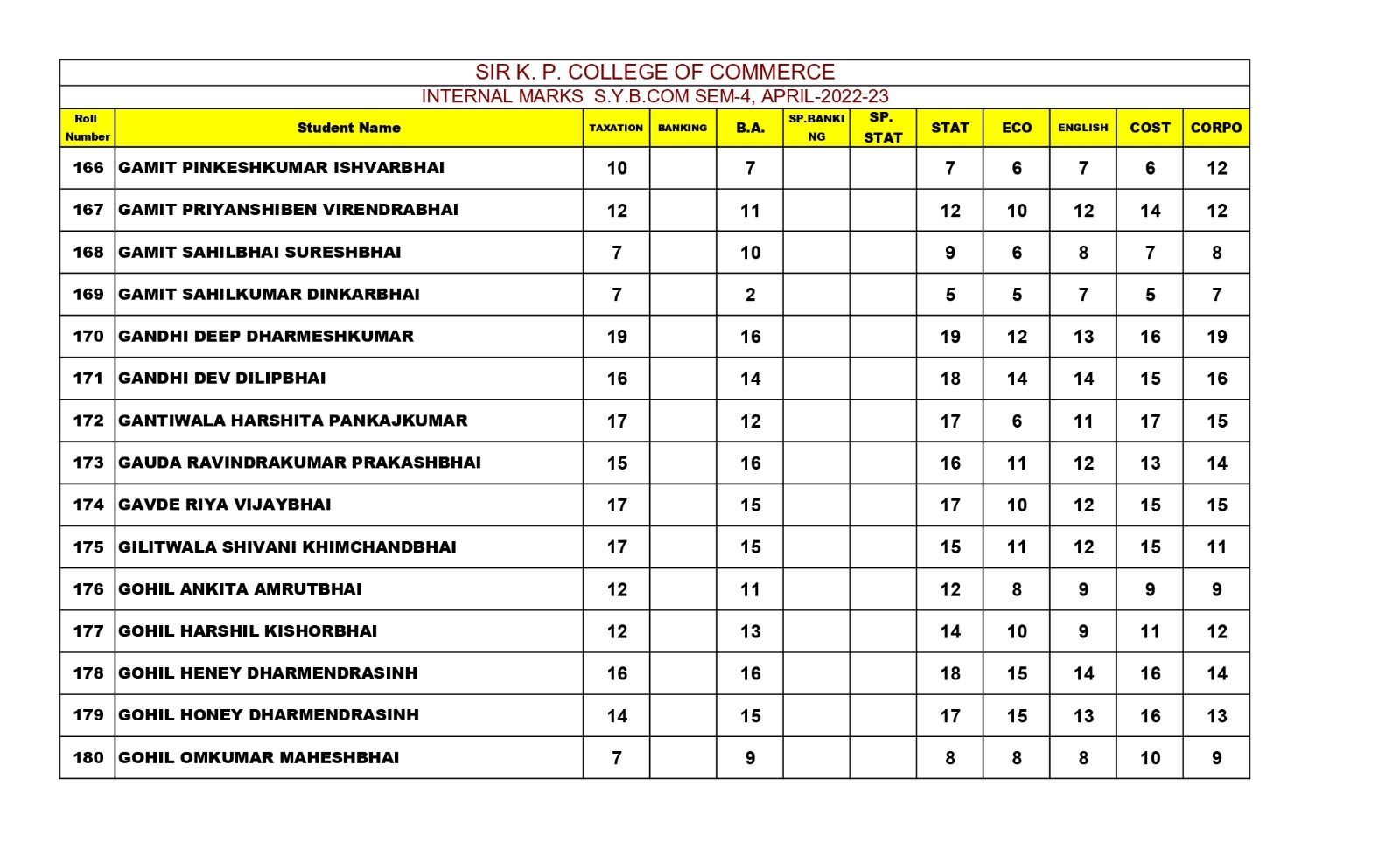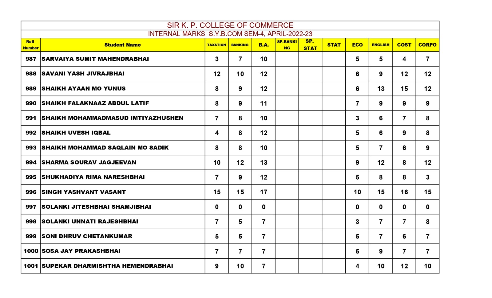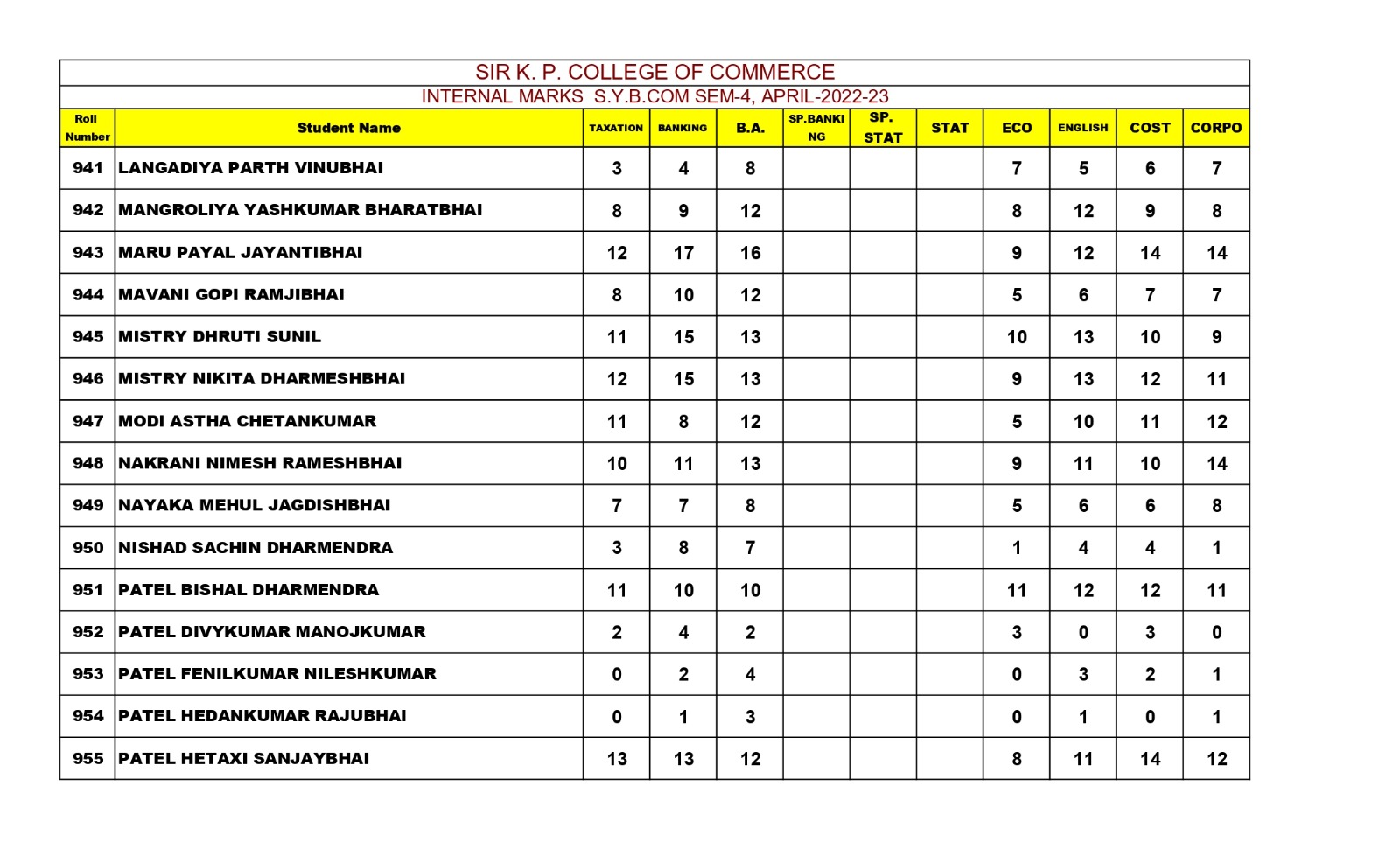 એસ.વાય.બી.કોમ સેમ -૪ નાં INTERNAL MARK નીચે મુજબ વિદ્યાર્થીઓના વિષય પ્રમાણે PDF આપેલ છે. વિદ્યાર્થીઓને Internal Mark બાબતે કોઈ પ્રશ્ન હોય તો તા.૩૧ માર્ચ ૨૦૨૩ શુક્રવાર સવારે ૧૧ થી ૨ બપોર ૨ વાગ્યા સુધીમાં ફરજીયાત રૂબરૂ આવીને કોલેજમાં મળી જવું શુક્રવાર બાદ કોઈ પણ રજુઆત ગાહ્યા રાખવામા આવશે નહી જેની દરેક વિધાર્થીઓએ નોંધ લેવી.