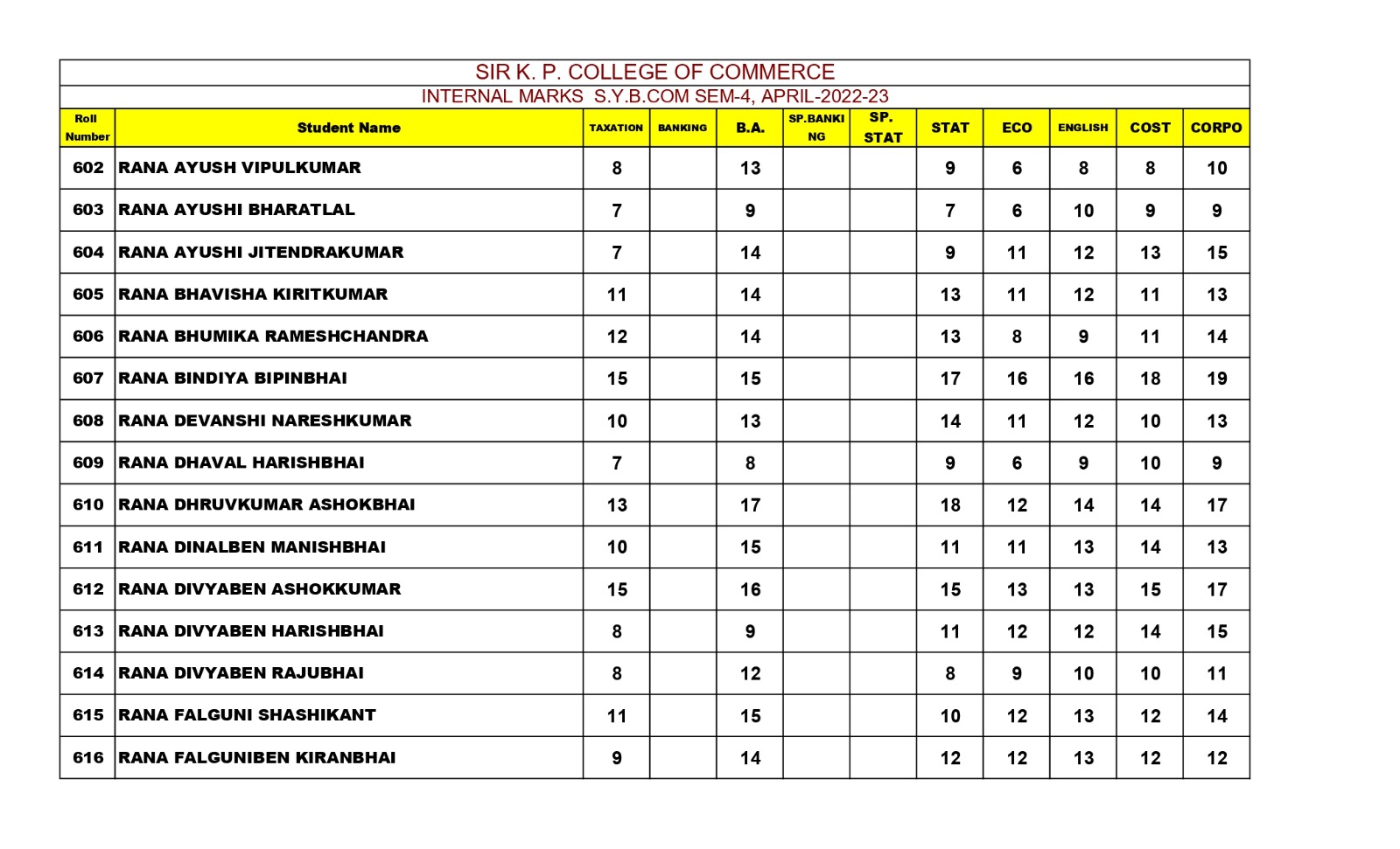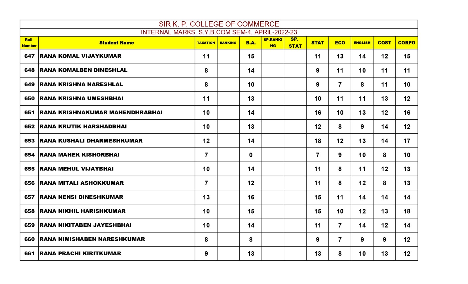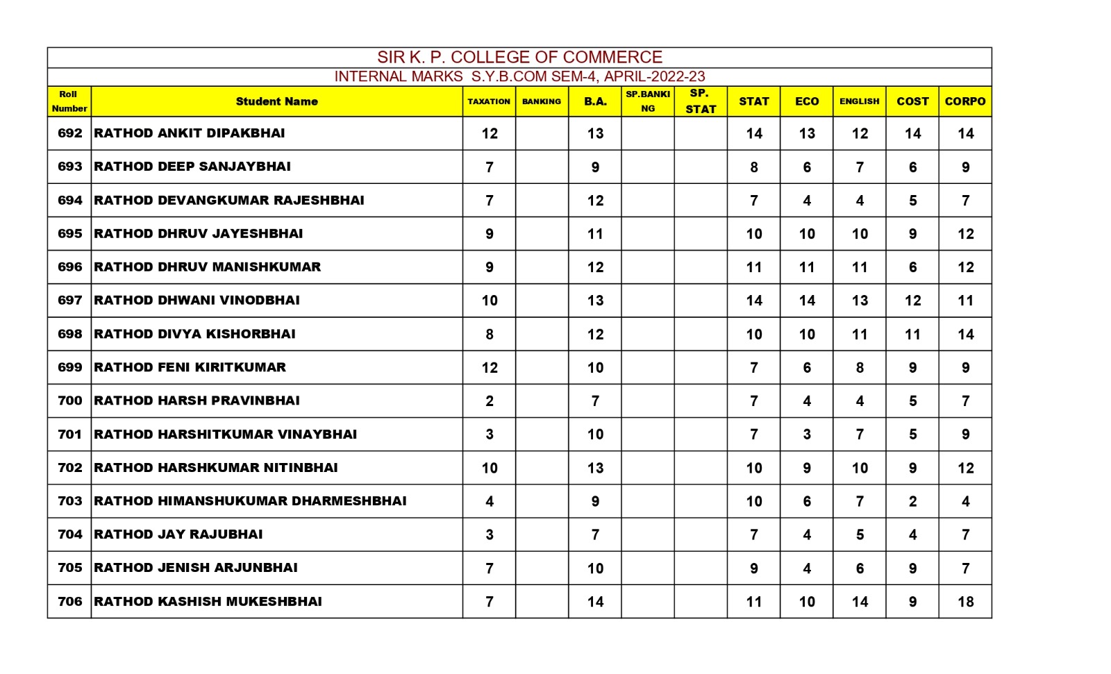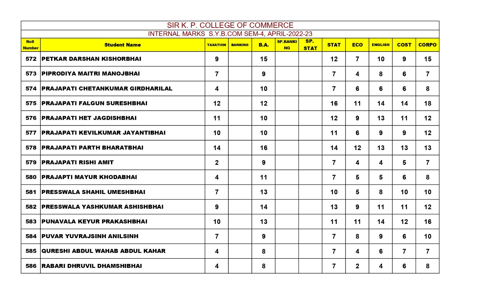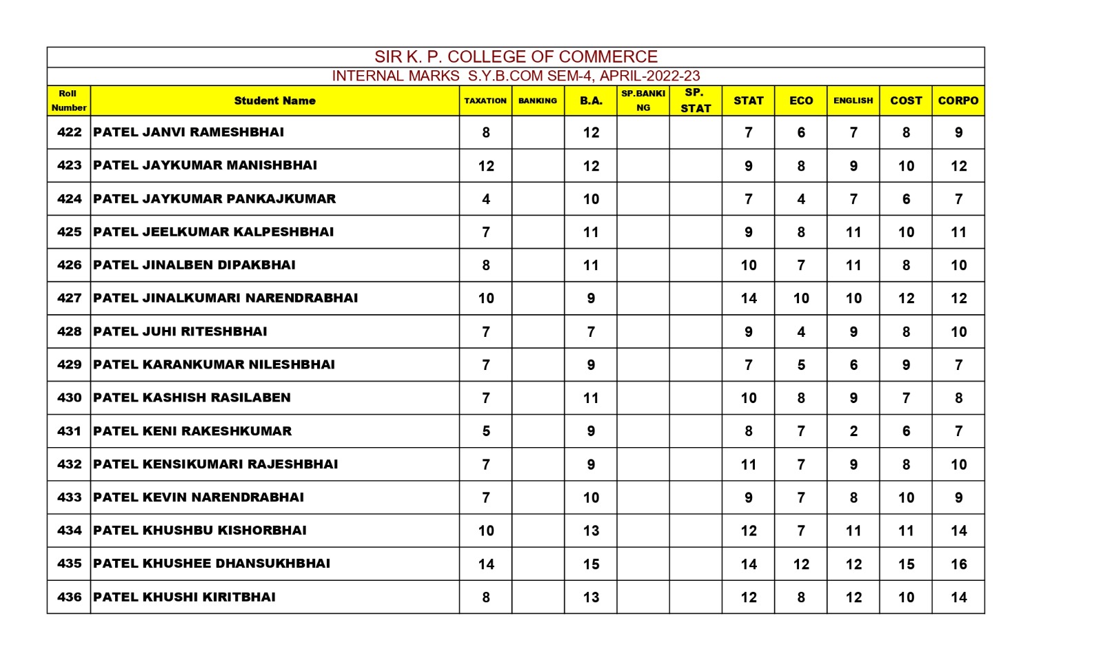 એસ.વાય.બી.કોમ સેમ -૪ નાં INTERNAL MARK નીચે મુજબ વિદ્યાર્થીઓના વિષય પ્રમાણે PDF આપેલ છે. વિદ્યાર્થીઓને Internal Mark બાબતે કોઈ પ્રશ્ન હોય તો તા.૩૧ માર્ચ ૨૦૨૩ શુક્રવાર સવારે ૧૧ થી ૨ બપોર ૨ વાગ્યા સુધીમાં ફરજીયાત રૂબરૂ આવીને કોલેજમાં મળી જવું શુક્રવાર બાદ કોઈ પણ રજુઆત ગાહ્યા રાખવામા આવશે નહી જેની દરેક વિધાર્થીઓએ નોંધ લેવી.