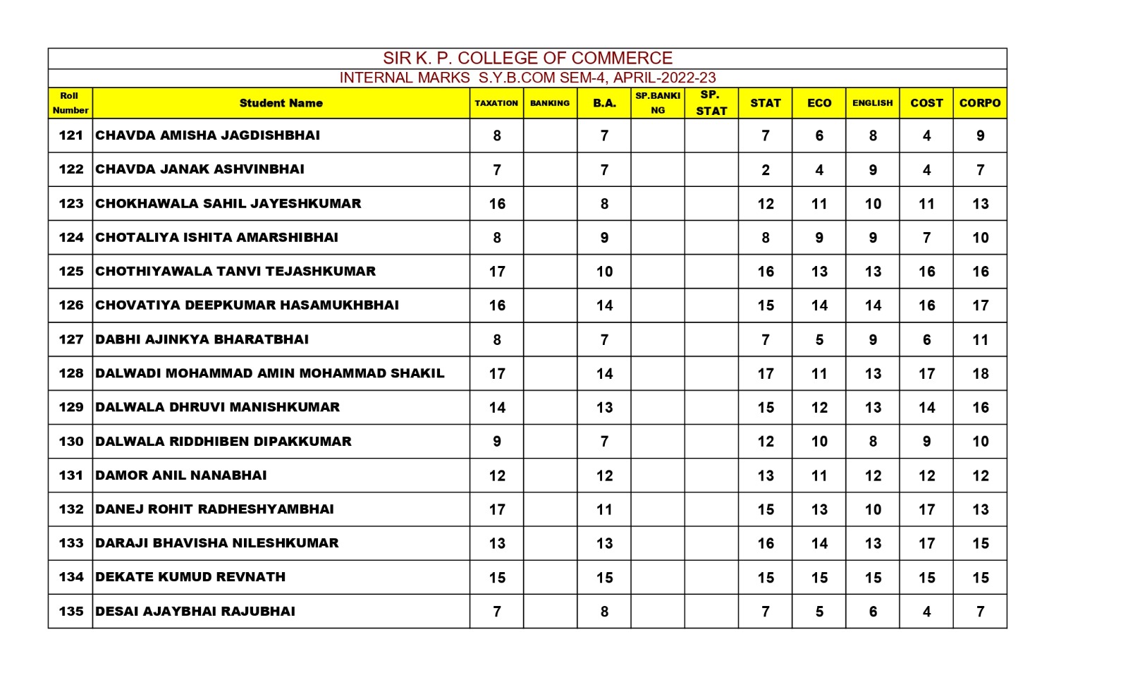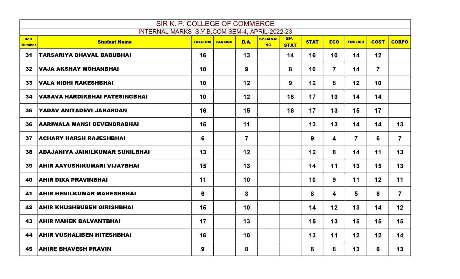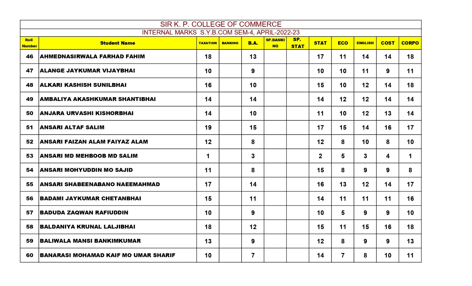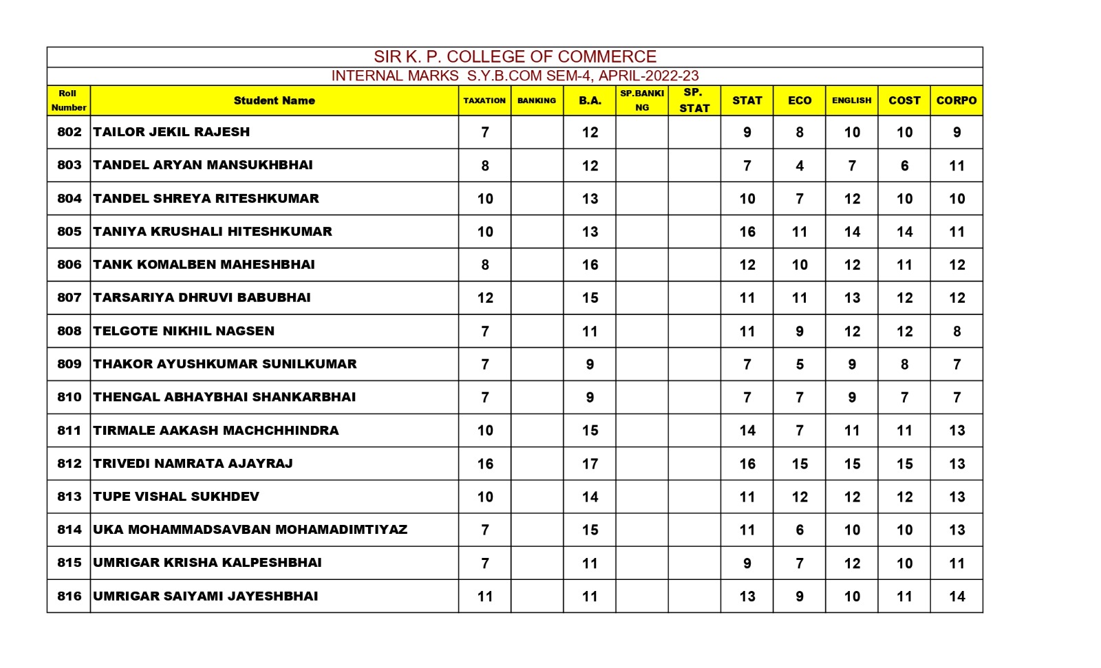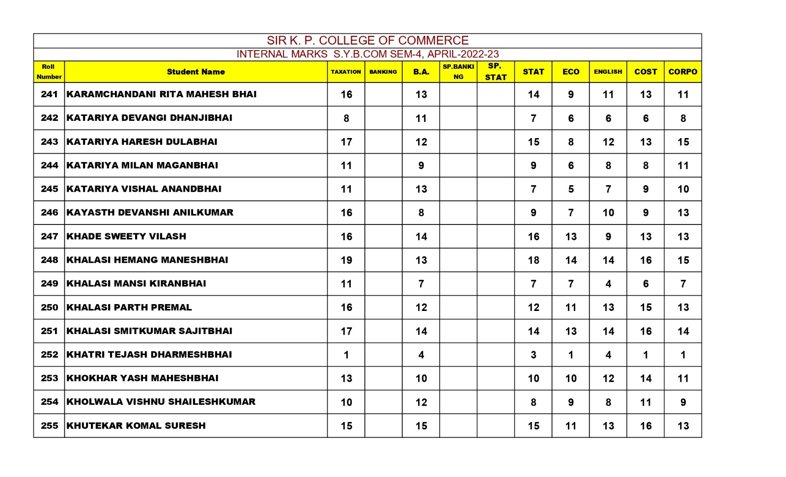 એસ.વાય.બી.કોમ સેમ -૪ નાં INTERNAL MARK નીચે મુજબ વિદ્યાર્થીઓના વિષય પ્રમાણે PDF આપેલ છે. વિદ્યાર્થીઓને Internal Mark બાબતે કોઈ પ્રશ્ન હોય તો તા.૩૧ માર્ચ ૨૦૨૩ શુક્રવાર સવારે ૧૧ થી ૨ બપોર ૨ વાગ્યા સુધીમાં ફરજીયાત રૂબરૂ આવીને કોલેજમાં મળી જવું શુક્રવાર બાદ કોઈ પણ રજુઆત ગાહ્યા રાખવામા આવશે નહી જેની દરેક વિધાર્થીઓએ નોંધ લેવી.