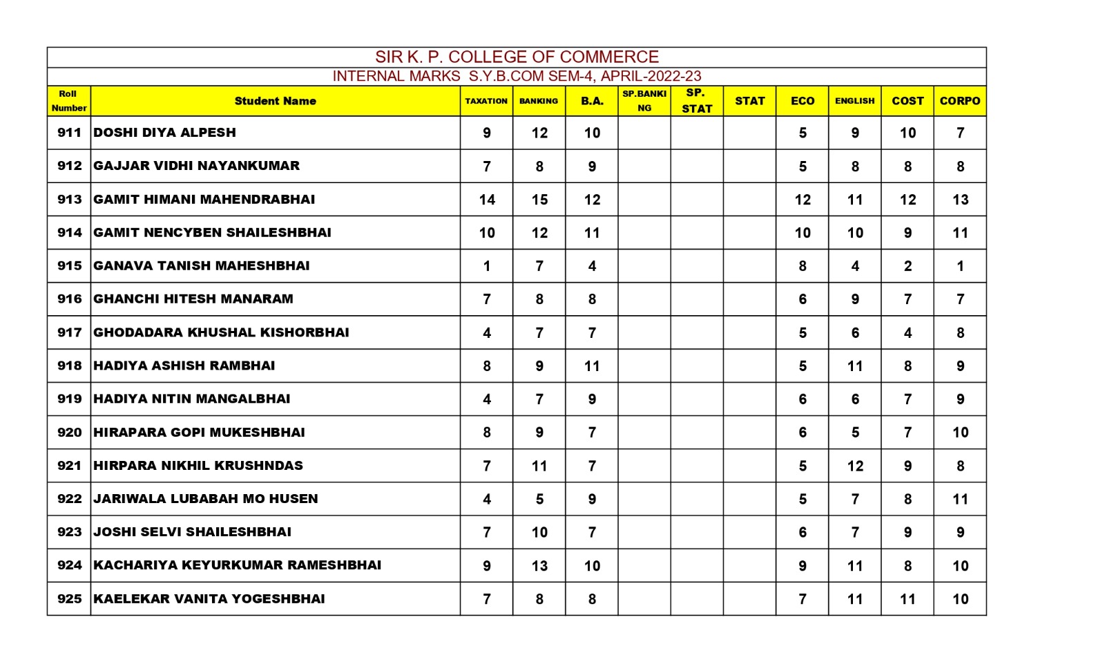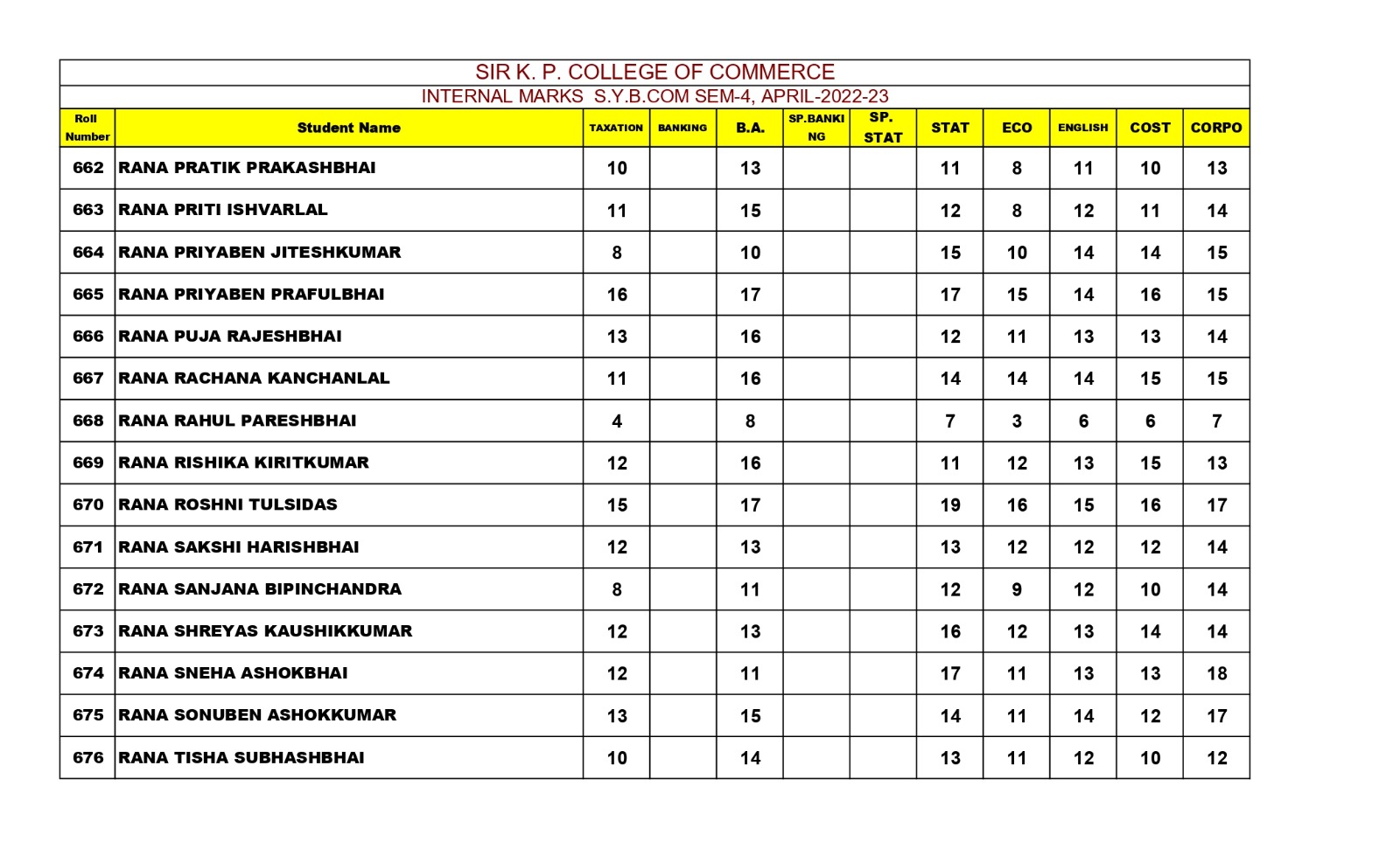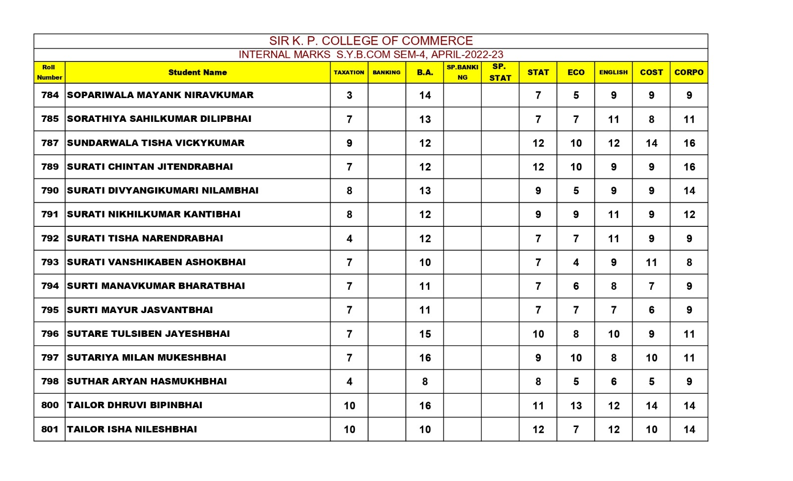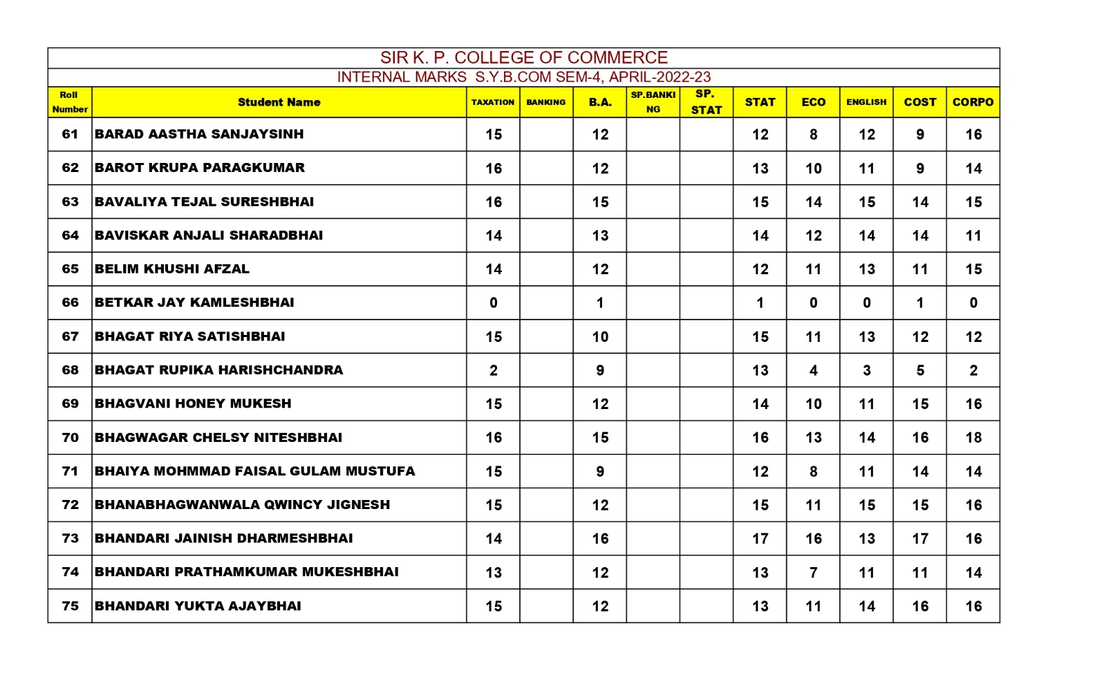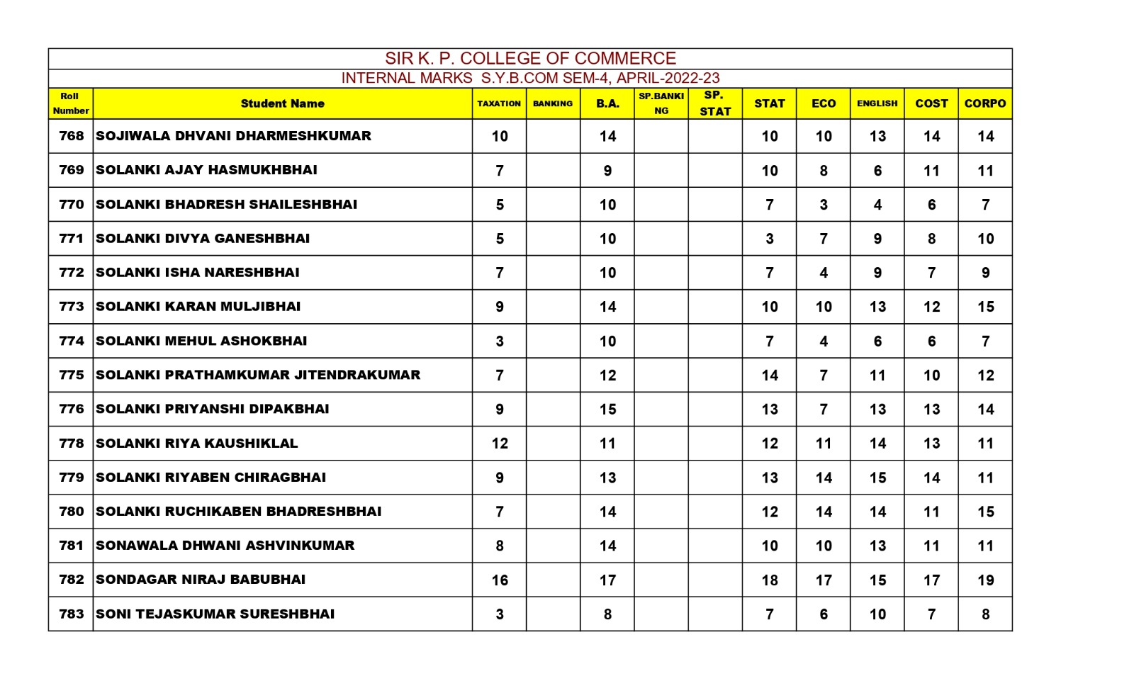 એસ.વાય.બી.કોમ સેમ -૪ નાં INTERNAL MARK નીચે મુજબ વિદ્યાર્થીઓના વિષય પ્રમાણે PDF આપેલ છે. વિદ્યાર્થીઓને Internal Mark બાબતે કોઈ પ્રશ્ન હોય તો તા.૩૧ માર્ચ ૨૦૨૩ શુક્રવાર સવારે ૧૧ થી ૨ બપોર ૨ વાગ્યા સુધીમાં ફરજીયાત રૂબરૂ આવીને કોલેજમાં મળી જવું શુક્રવાર બાદ કોઈ પણ રજુઆત ગાહ્યા રાખવામા આવશે નહી જેની દરેક વિધાર્થીઓએ નોંધ લેવી.