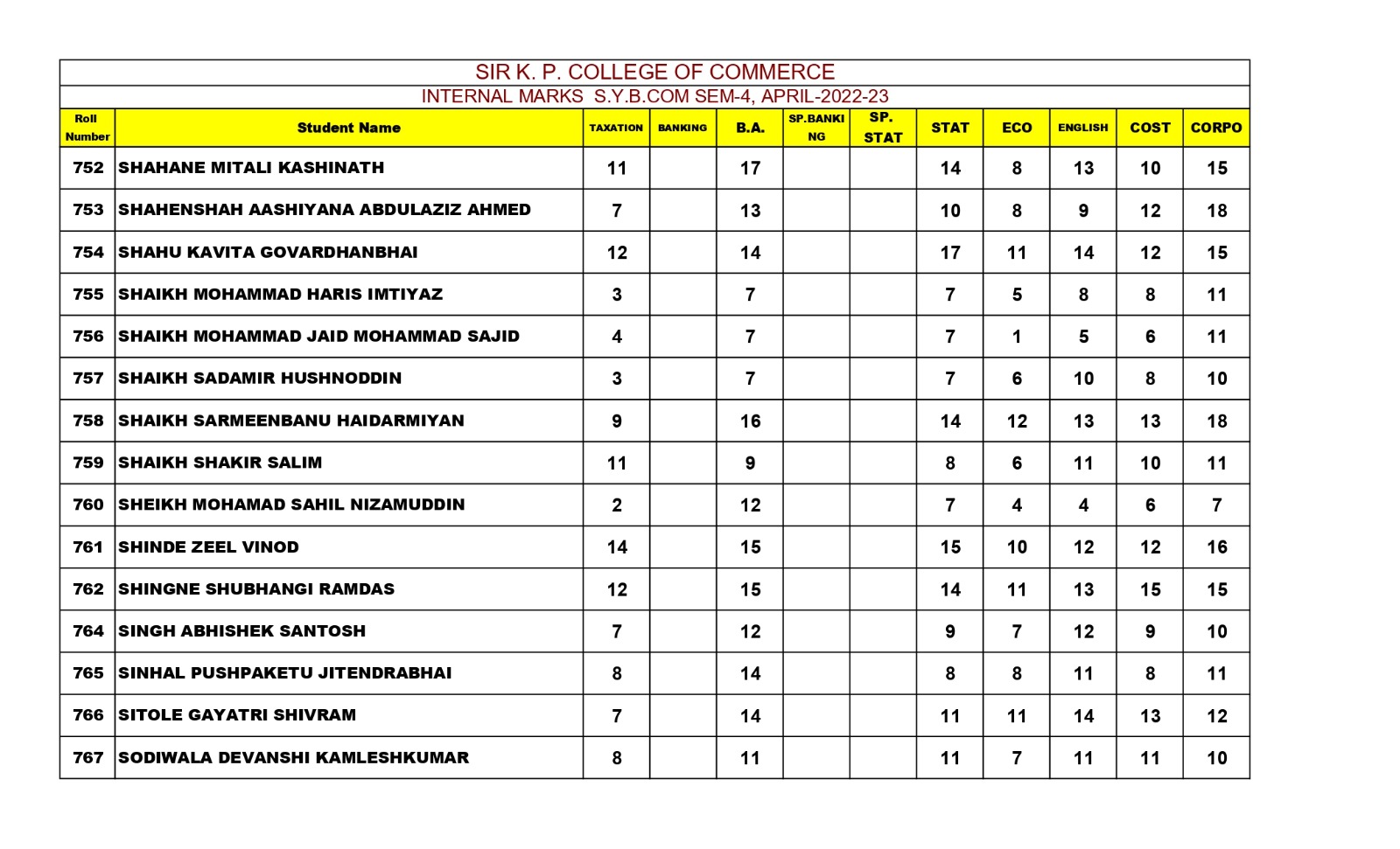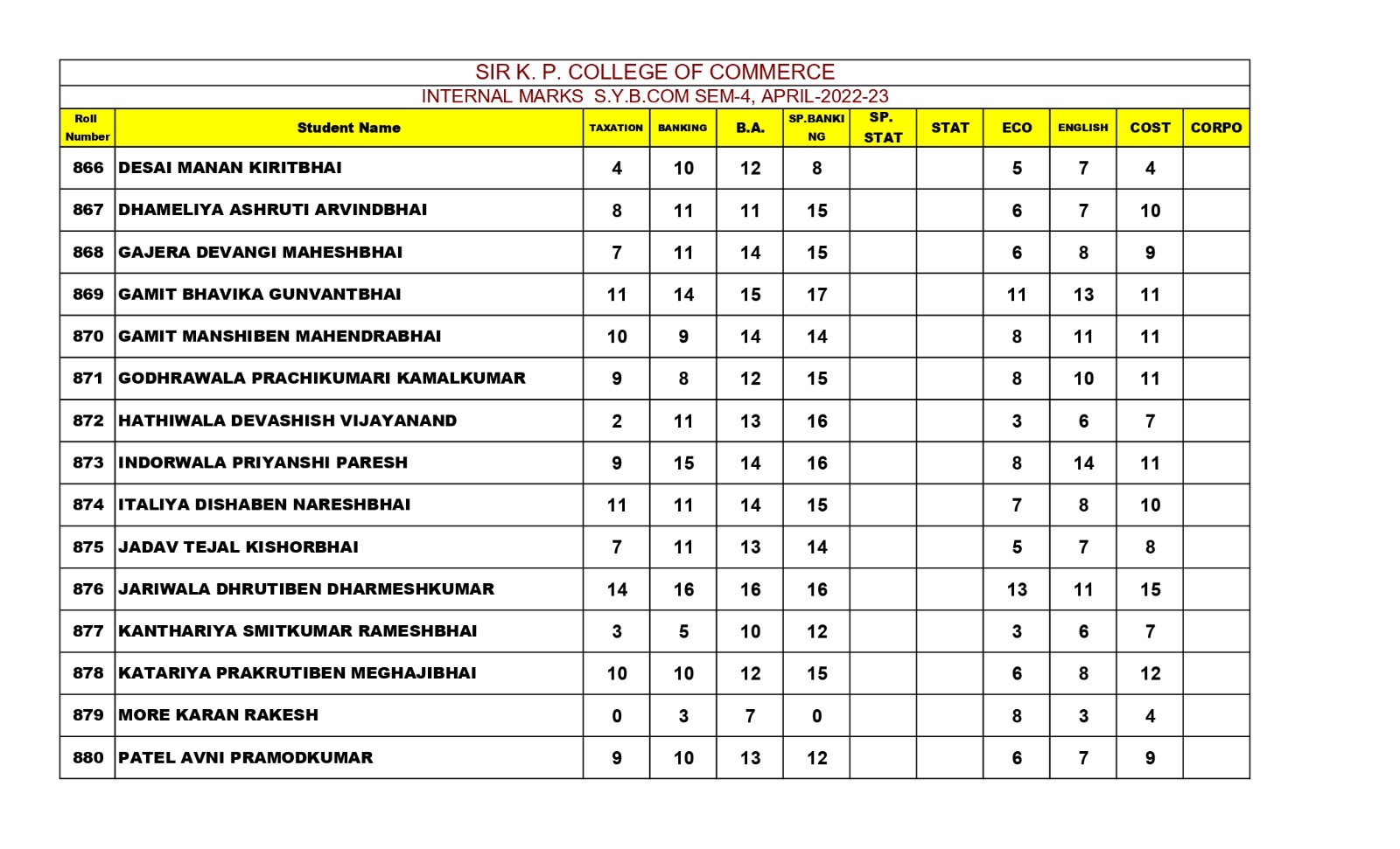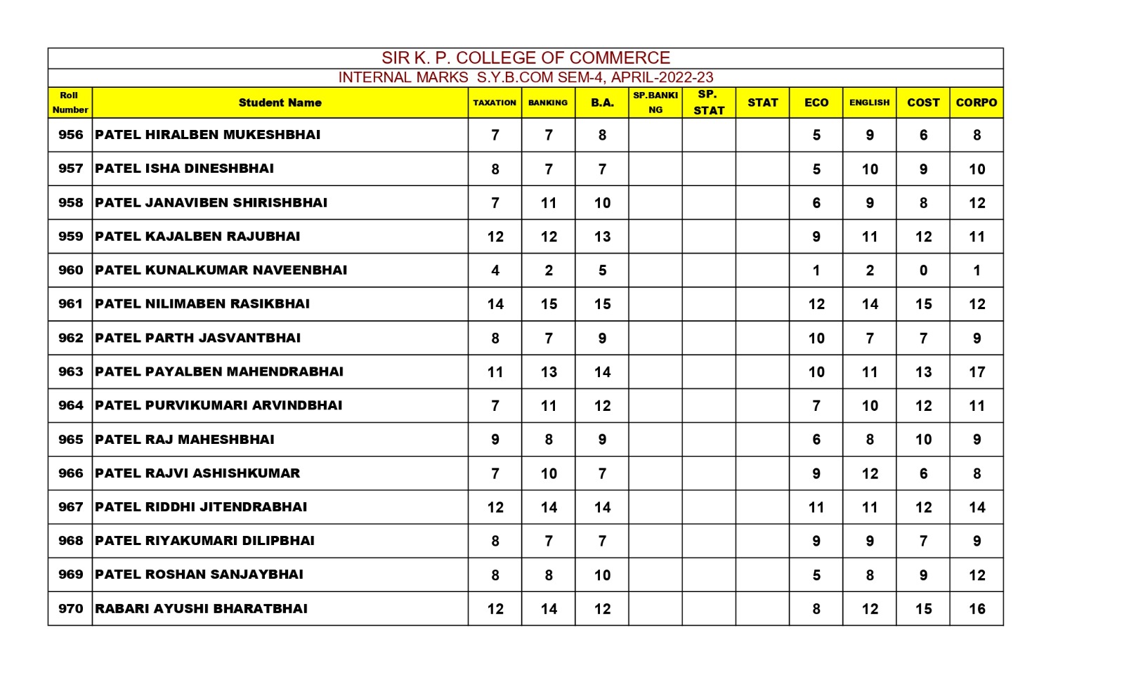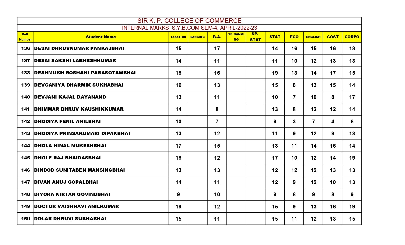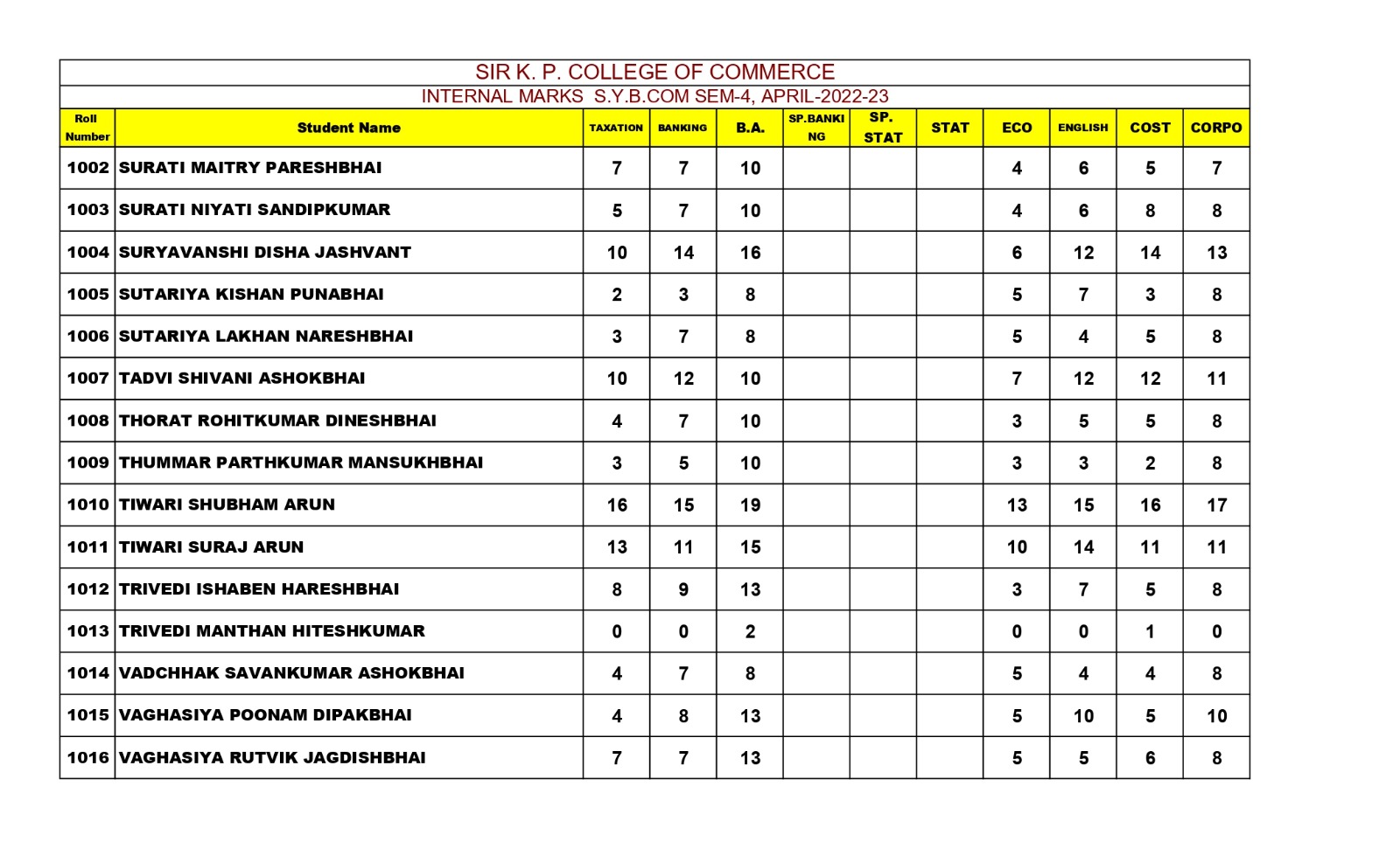 એસ.વાય.બી.કોમ સેમ -૪ નાં INTERNAL MARK નીચે મુજબ વિદ્યાર્થીઓના વિષય પ્રમાણે PDF આપેલ છે. વિદ્યાર્થીઓને Internal Mark બાબતે કોઈ પ્રશ્ન હોય તો તા.૩૧ માર્ચ ૨૦૨૩ શુક્રવાર સવારે ૧૧ થી ૨ બપોર ૨ વાગ્યા સુધીમાં ફરજીયાત રૂબરૂ આવીને કોલેજમાં મળી જવું શુક્રવાર બાદ કોઈ પણ રજુઆત ગાહ્યા રાખવામા આવશે નહી જેની દરેક વિધાર્થીઓએ નોંધ લેવી.
