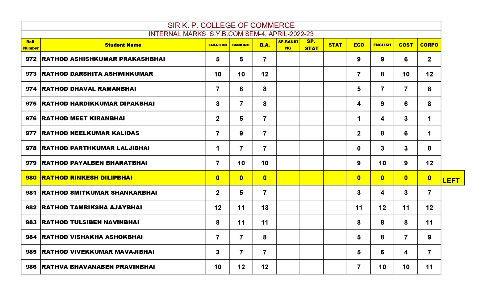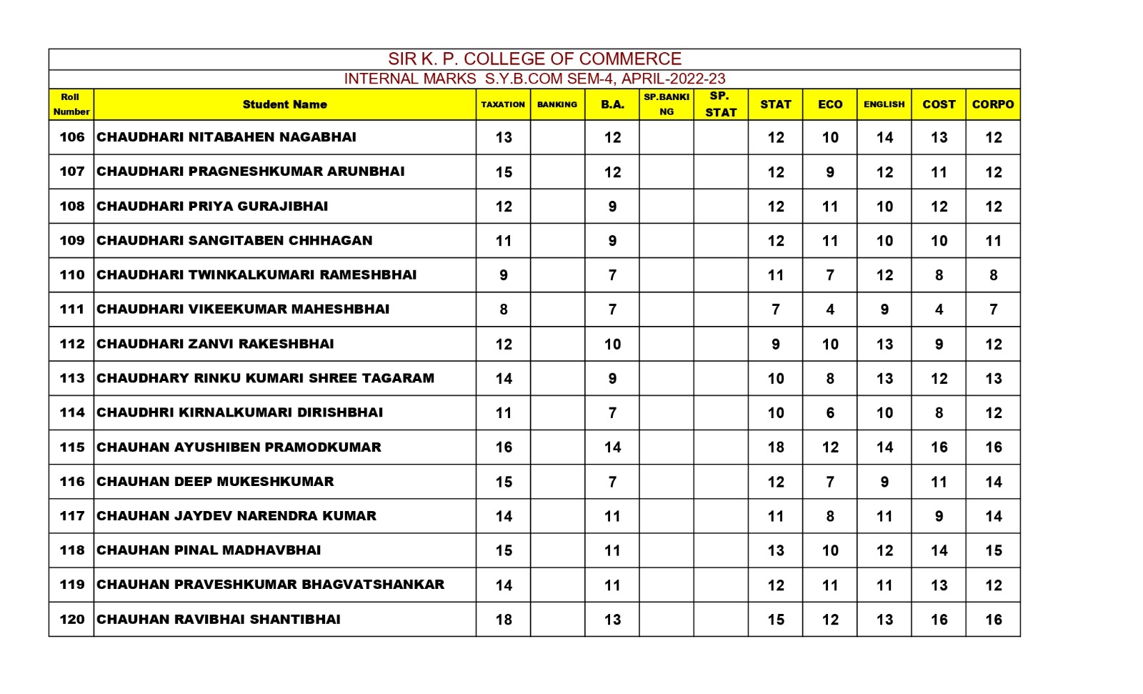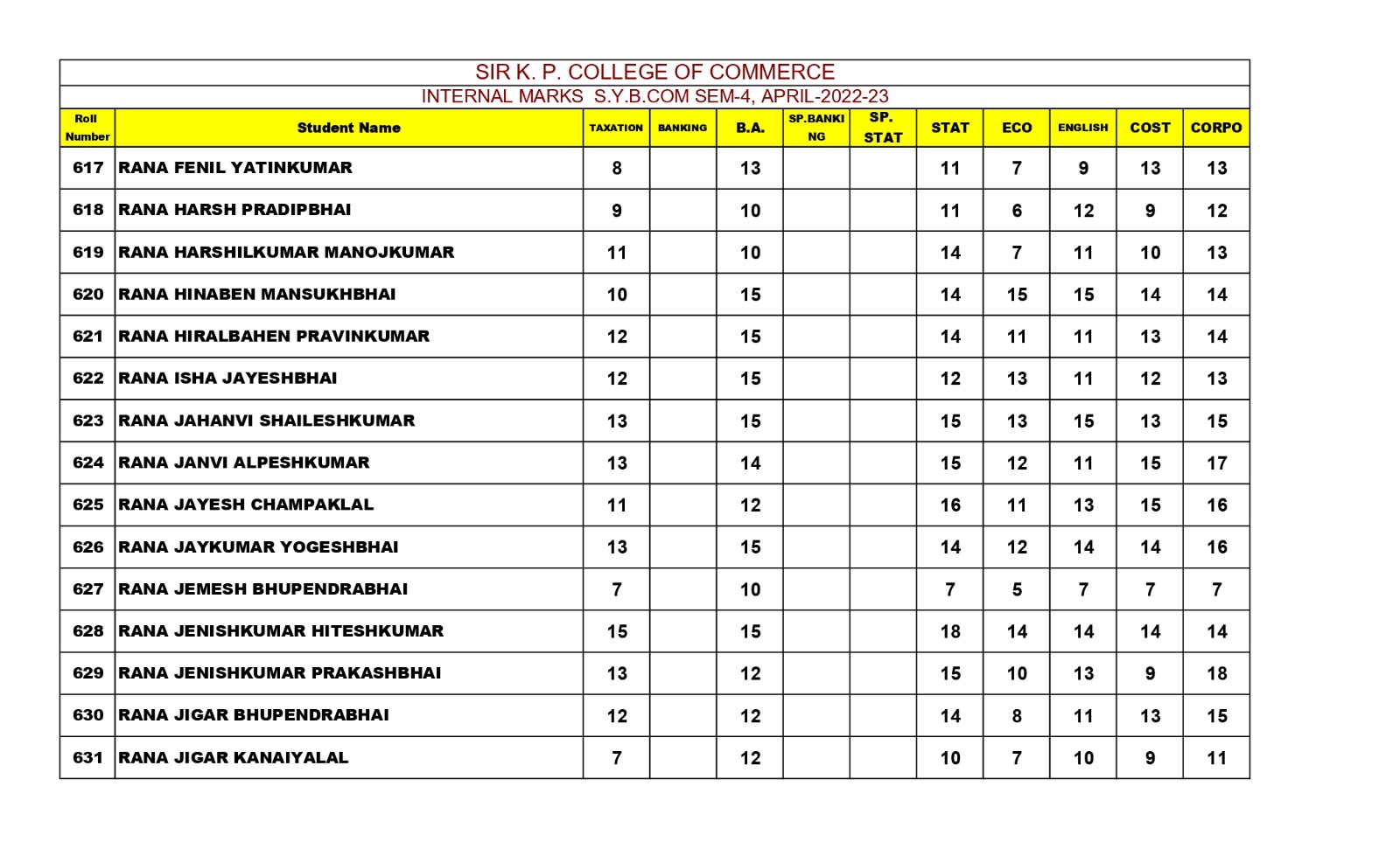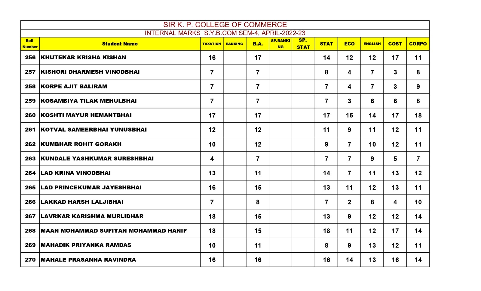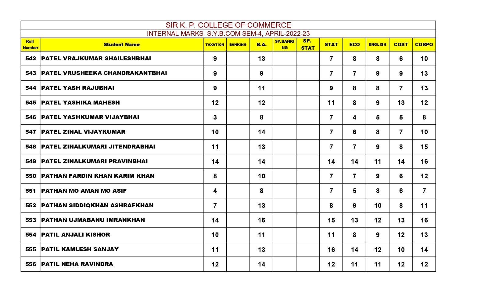 એસ.વાય.બી.કોમ સેમ -૪ નાં INTERNAL MARK નીચે મુજબ વિદ્યાર્થીઓના વિષય પ્રમાણે PDF આપેલ છે. વિદ્યાર્થીઓને Internal Mark બાબતે કોઈ પ્રશ્ન હોય તો તા.૩૧ માર્ચ ૨૦૨૩ શુક્રવાર સવારે ૧૧ થી ૨ બપોર ૨ વાગ્યા સુધીમાં ફરજીયાત રૂબરૂ આવીને કોલેજમાં મળી જવું શુક્રવાર બાદ કોઈ પણ રજુઆત ગાહ્યા રાખવામા આવશે નહી જેની દરેક વિધાર્થીઓએ નોંધ લેવી.