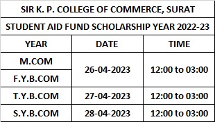 STUDENT AID FUND YEAR 2022-23 ની સ્કોલરશીપ નીચેના સમય મુજબ લઇ જવાની રહેશે. Apr 25, 2023 STUDENT AID FUND YEAR 2022-23 ની સ્કોલરશીપ નીચેના સમય મુજબ લઇ જવાની રહેશે. ખાસ નોધ : રીન્યુ થયેલ આઈ કાર્ડ ફરજીયાત લઇ ને આવવાનો રહેશે. PDF LINK ⇓ M.COM PART-I STUDENT AID FUNDS SCHOLARSHIP F.Y.B.COM REGULAR STUDENT AID FUND T.Y.B.COM REGULAR STUDENT AID FUND S.Y. BOCM REGULAR STUDENT AID FUND M.COM PART-2 STUDENT AID FUND SCHOLARSHIP