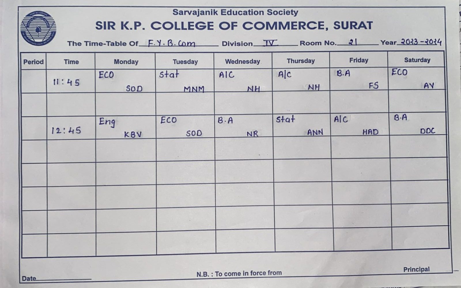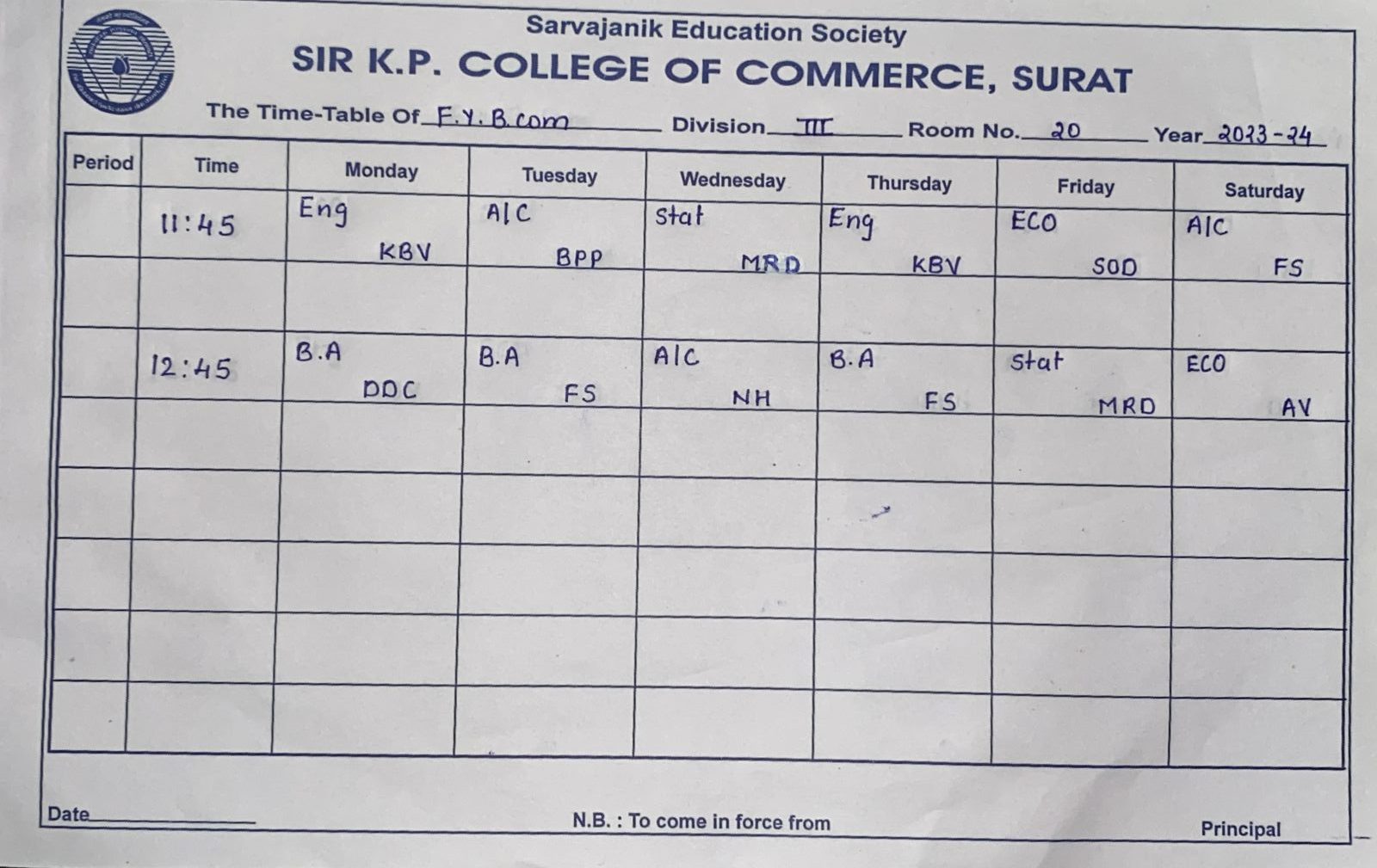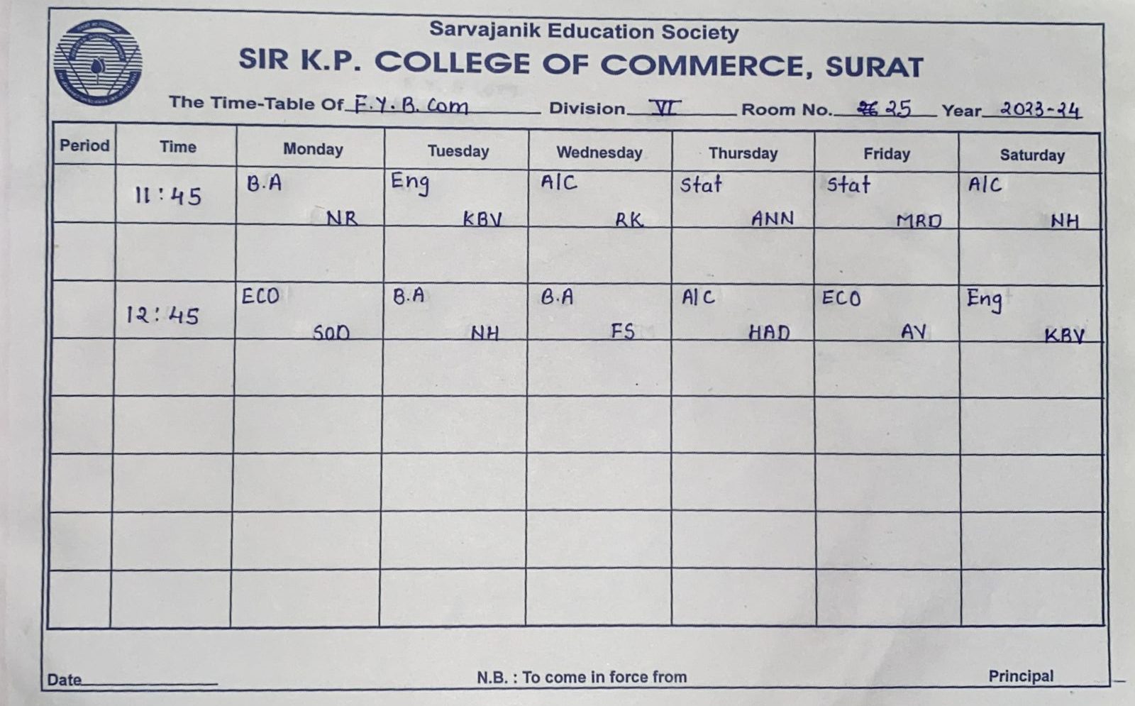 NEW ADMISSION F.Y.B.COM SEM-1 ના વિદ્યાર્થીઓ માટે નું TIME TABLE Jul 19, 2023 NEW ADMISSION F.Y.B.COM SEM-1 ના વિદ્યાર્થીઓ માટે નું TIME TABLE નીચે મુજબ રહશે. દરેક વિદ્યાર્થીઓએ પોતાના ડિવિઝન મુજબ સમયસર વર્ગો માં બેસવા નું રહશે. નોધ:- DIVISON સાથે કયા ROOM NO માં બેસવા નું છે તે TIME TABLE માં લખેલ છે.