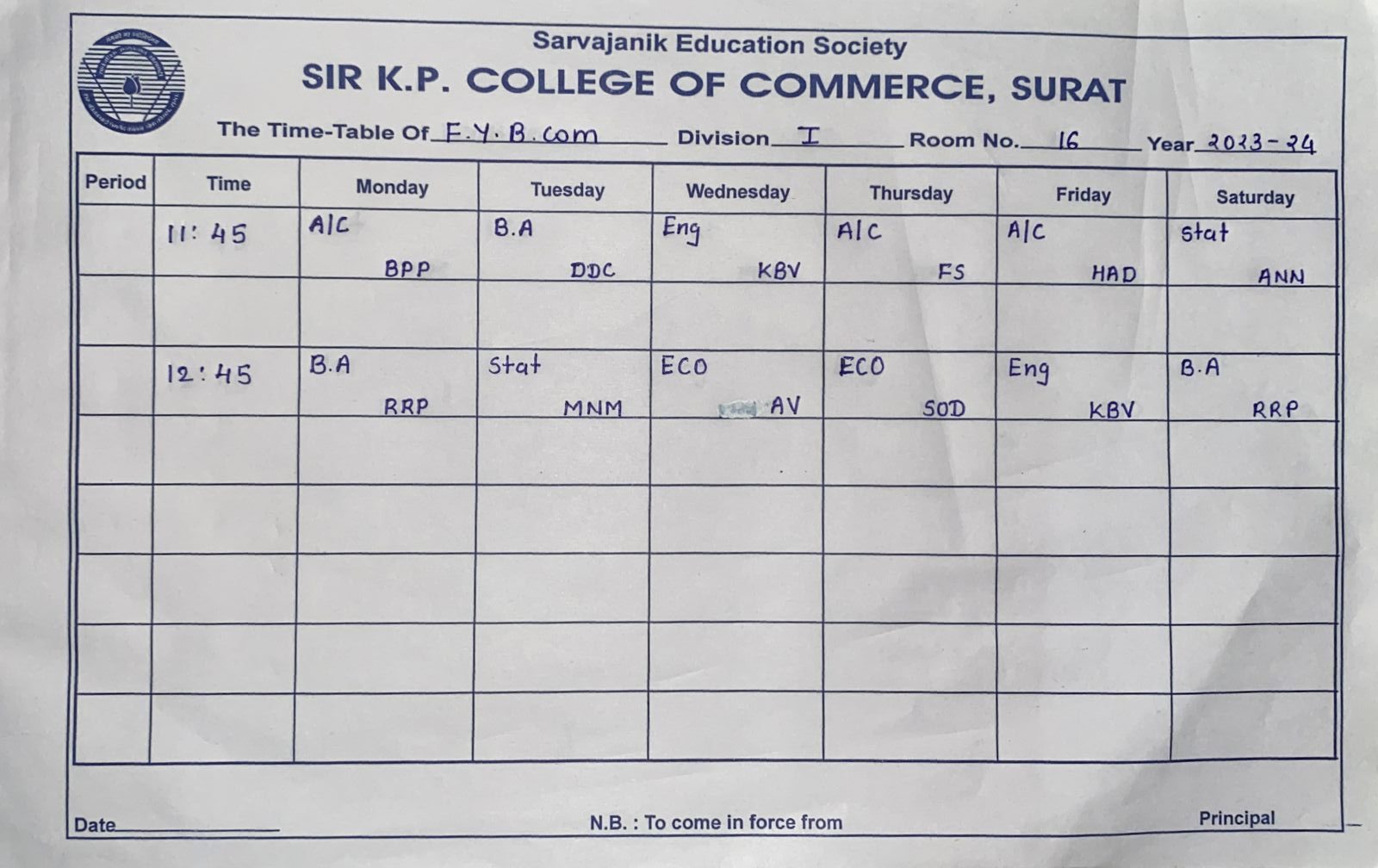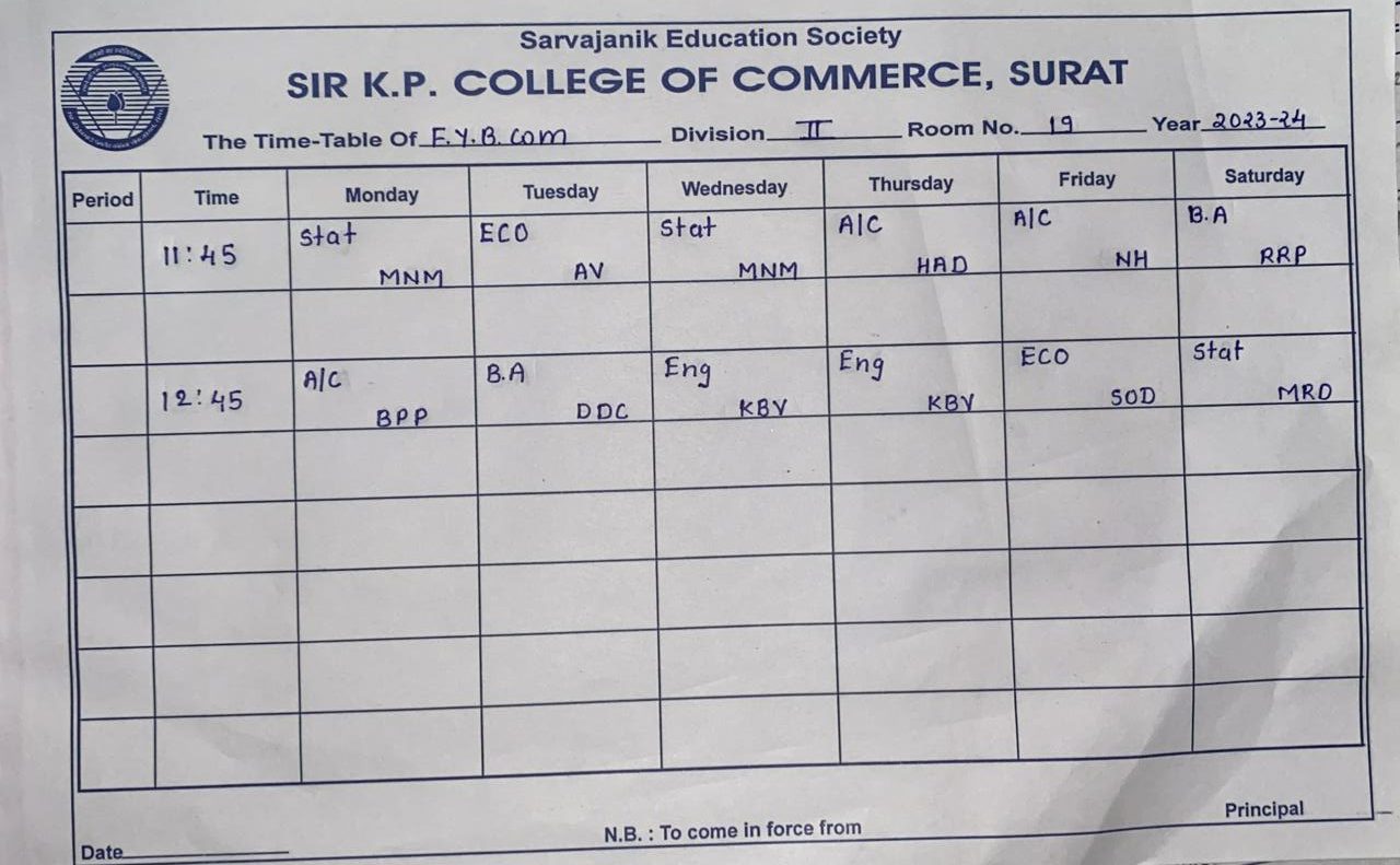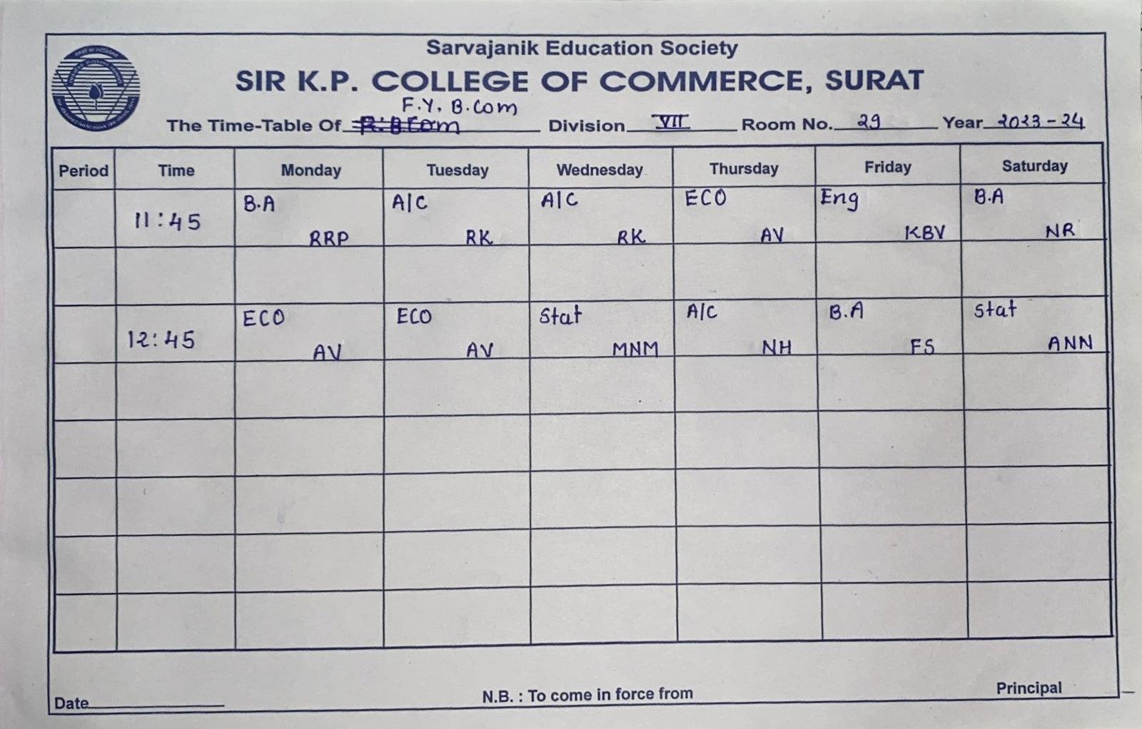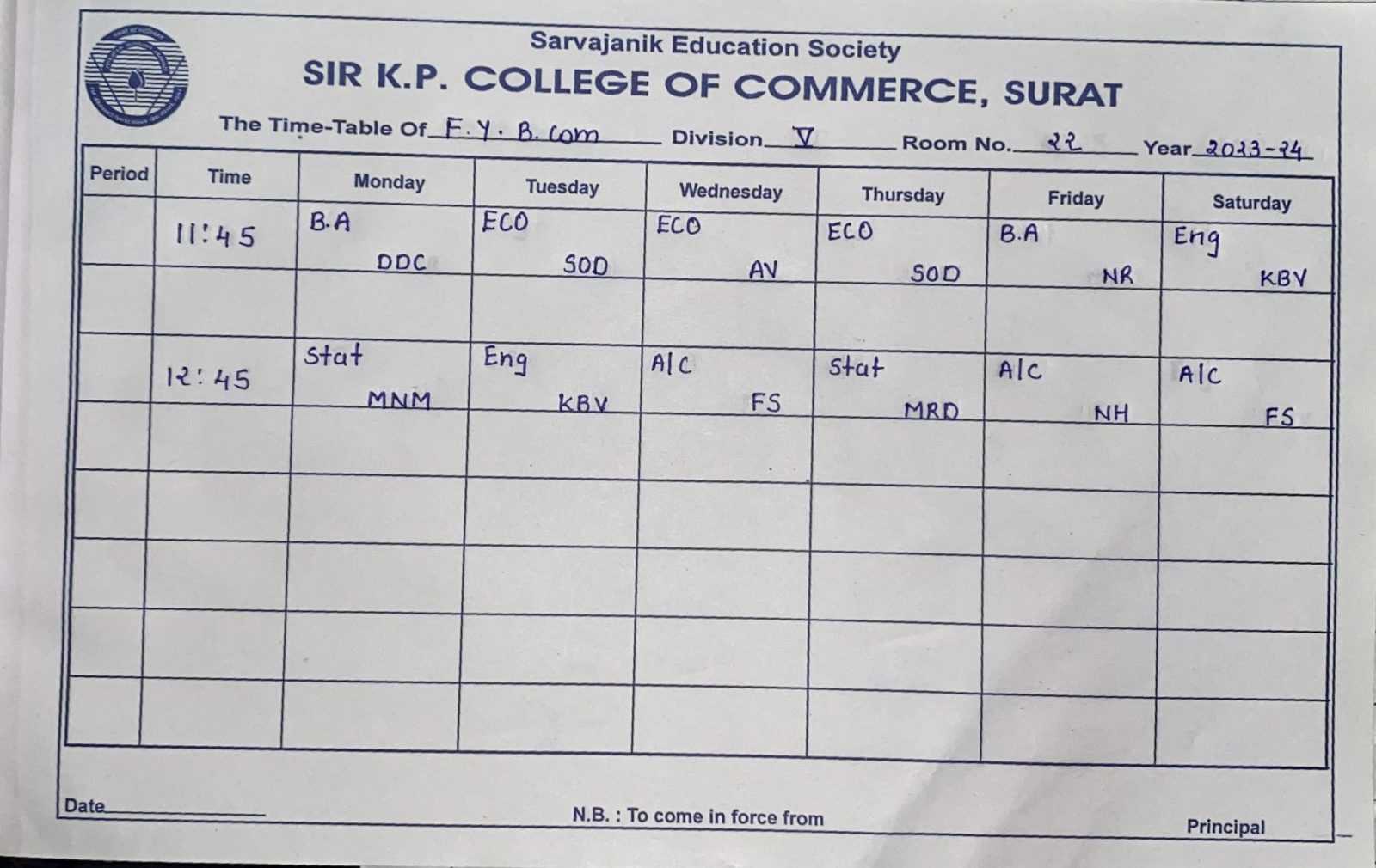 NEW ADMISSION F.Y.B.COM SEM-1 ના વિદ્યાર્થીઓ માટે નું TIME TABLE Jul 19, 2023 NEW ADMISSION F.Y.B.COM SEM-1 ના વિદ્યાર્થીઓ માટે નું TIME TABLE નીચે મુજબ રહશે. દરેક વિદ્યાર્થીઓએ પોતાના ડિવિઝન મુજબ સમયસર વર્ગો માં બેસવા નું રહશે. નોધ:- DIVISON સાથે કયા ROOM NO માં બેસવા નું છે તે TIME TABLE માં લખેલ છે.