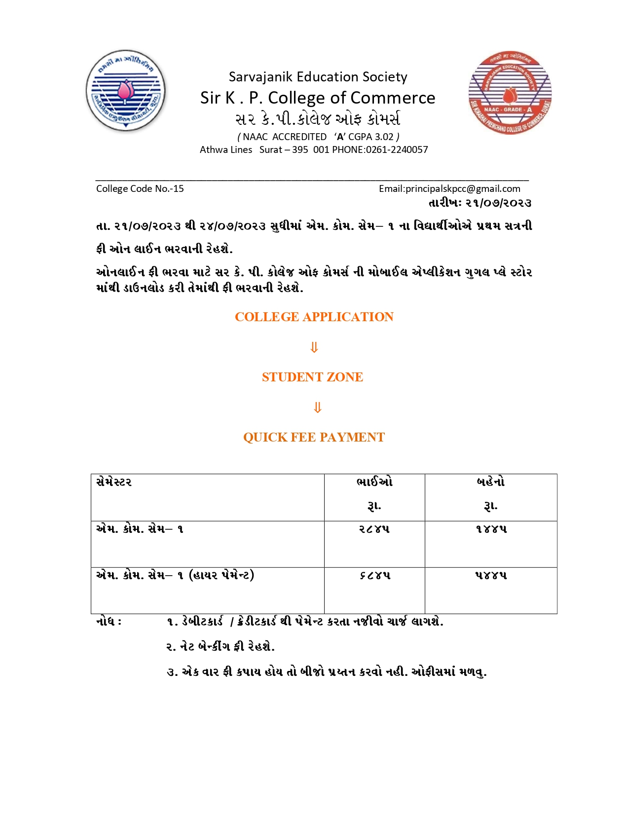 M.COM. SEM-I ની ફી ભરવા બાબત.