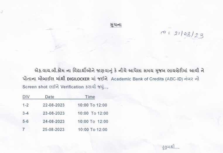 એફ.વાય.બી.કોમ આઈકાર્ડ માટે ની સૂચના 2023