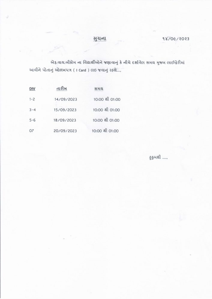 એફ.વાય.બી.કોમના વિદ્યાથીઓના આઈકાર્ડ મેળવવા માટેની સૂચના 2023-24