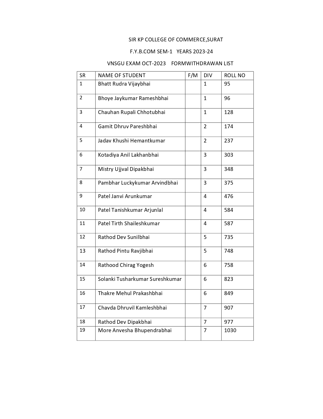 F.Y.B.COM SEM-1 FORM WITHDRAWAN LIST OCT-2023-24 VNSGU EXAM Nov 4, 2023 F.Y.B.COM SEM-1 FORM WITHDRAWAN LIST OCT-2023-24 VNSGU EXAM નોંધ:- જે પણ વિદ્યાર્થીઓના નામ FORM WITHDRAWAN LIST માં છે તેમને યુનિવર્સીટીની પરીક્ષામાં બેસવા દેવામાં આવશે નહિ.