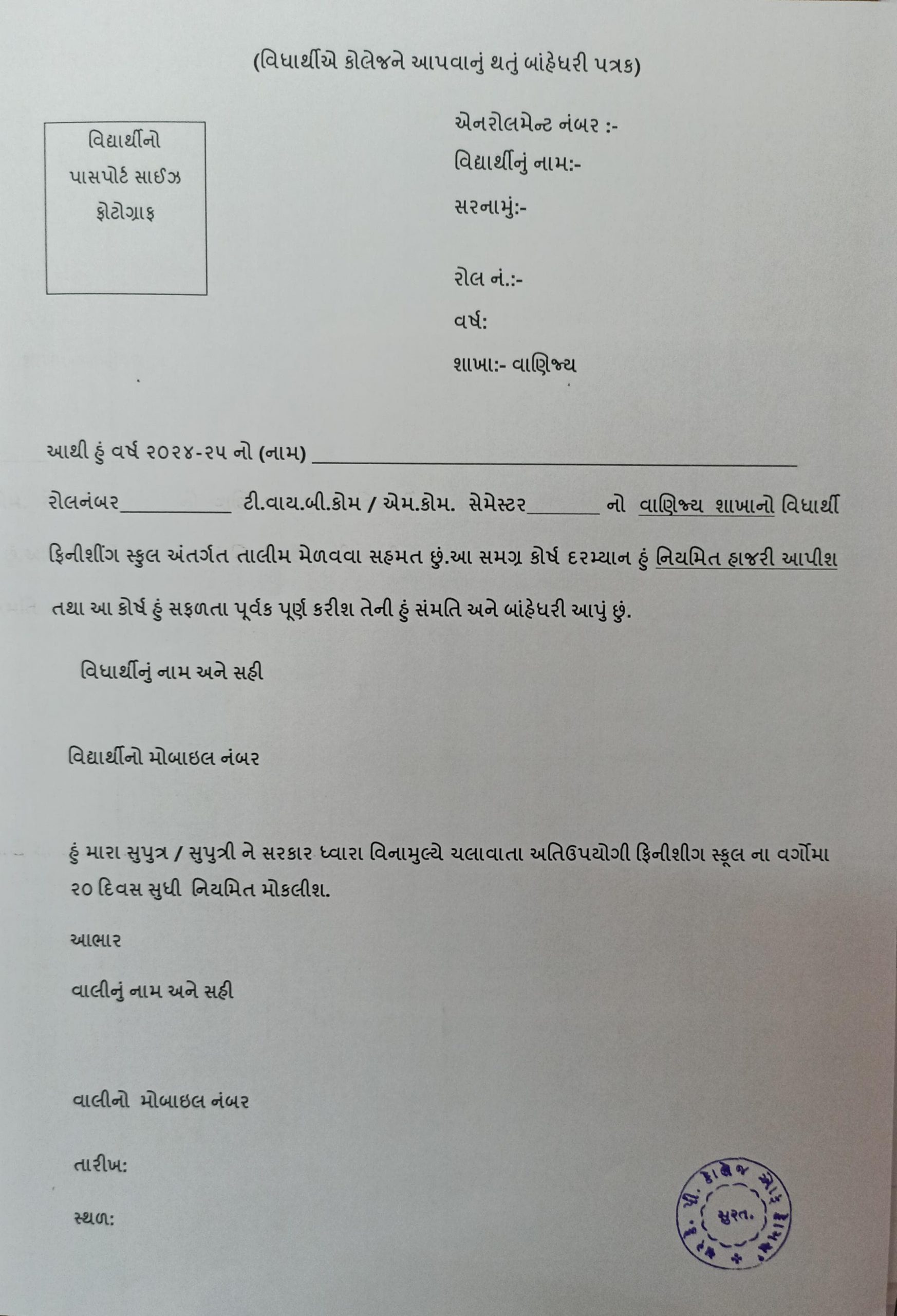 ઉઘડતી કોલેજે તુરત જ જૂન માસમાં ફિનિશિંગ સ્કૂલની તાલીમ શરુ થનાર છે તેમાં જોડાવા ઈચ્છતા જેઓએ એસ.વાય.બી.કોમની પરીક્ષા/ એમ.કોમ.સેમ.- 2 પરીક્ષા હાલમાં આપી છે તેઓ આ અંગેના ફોર્મ રુમ નં.- ૭ ઓફીસમાં શ્રીમતી હેતલબેન દેસાઈ પાસેથી લઈ જવા, આ અંગેનુ ફોર્મ કોલેજની એપ પર પણ મુકવામાં આવેલ છે તેમાંથી પણ પ્રિન્ટ આઉટ કઢાવી ફોર્મ ભરી આપી શકો છો. ટ્રેનિંગમાં ૧૦૦% હાજરી ફરજીયાત છે.