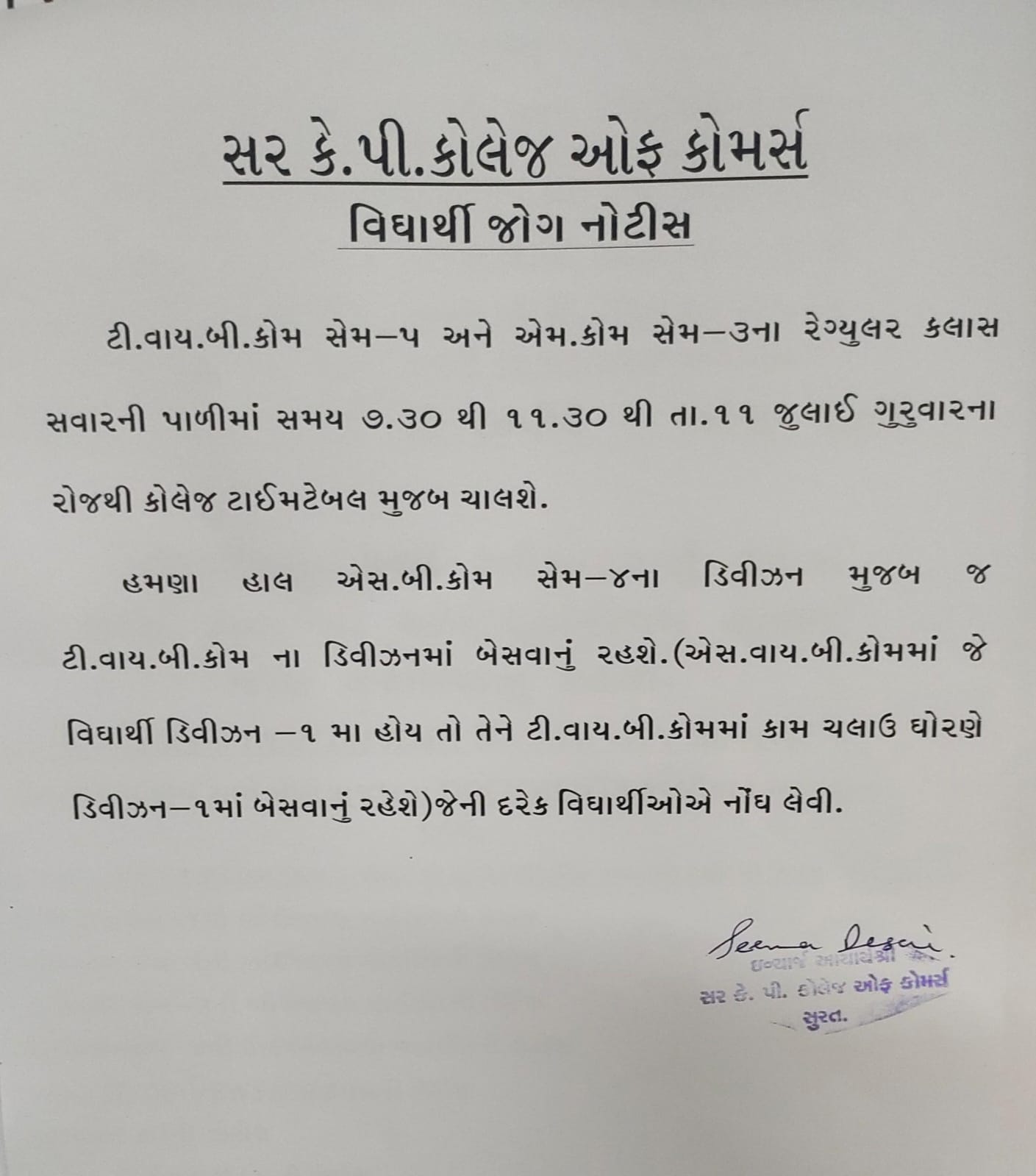 ખાસ નોંધ:- હમણા હાલ કામ ચલાઉ એસ.વાય.બી. કોમનાં ડિવિઝન મૂજબ ટી.વાય.બી.કોમ નાં કલાસમાં બેસવાનું રહશે.