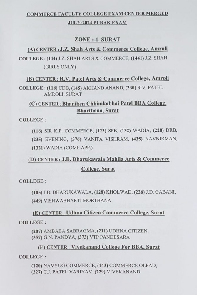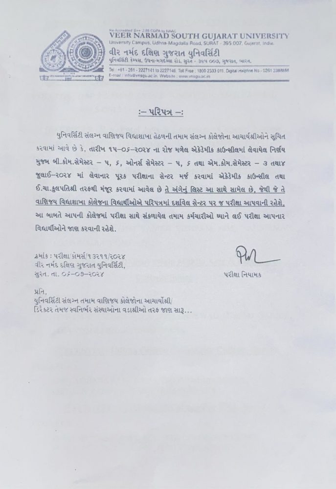 T.Y.B.COM SEM-5 અને SEM-6, HONORS SEM-5 અને SEM-6 તથા M.COM SEM-3 અને SEM-4 માં જે વિદ્યાર્થીઓએ JULY-2024 ની ATKT EXAM ના EXAM FORM ભરેલ છે. તે વિદ્યાર્થીઓએ નીચે આપેલ નોટીસ મુજબના CENTER પર જઈને EXAM આપવાની રહેશે.