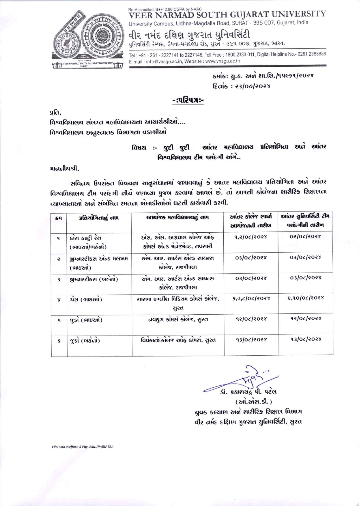 આથી સર કે.પી. કોલેજ ઓફ કોમર્સ ના તમામ વિદ્યાર્થીઓને જણાવવાનું કે નીચે મુજબની આંતર કોલેજ સ્પર્ધાઓનું આયોજન થનારા છે. તો ભાગ લેવા માંગતા વિદ્યાર્થીઓએ પોતાના નામો જીમખાના ઓફિસમાં સવારે ૧૦.૦૦ થી ૨.૦૦ માં નોધાવવા. Jul 25, 2024