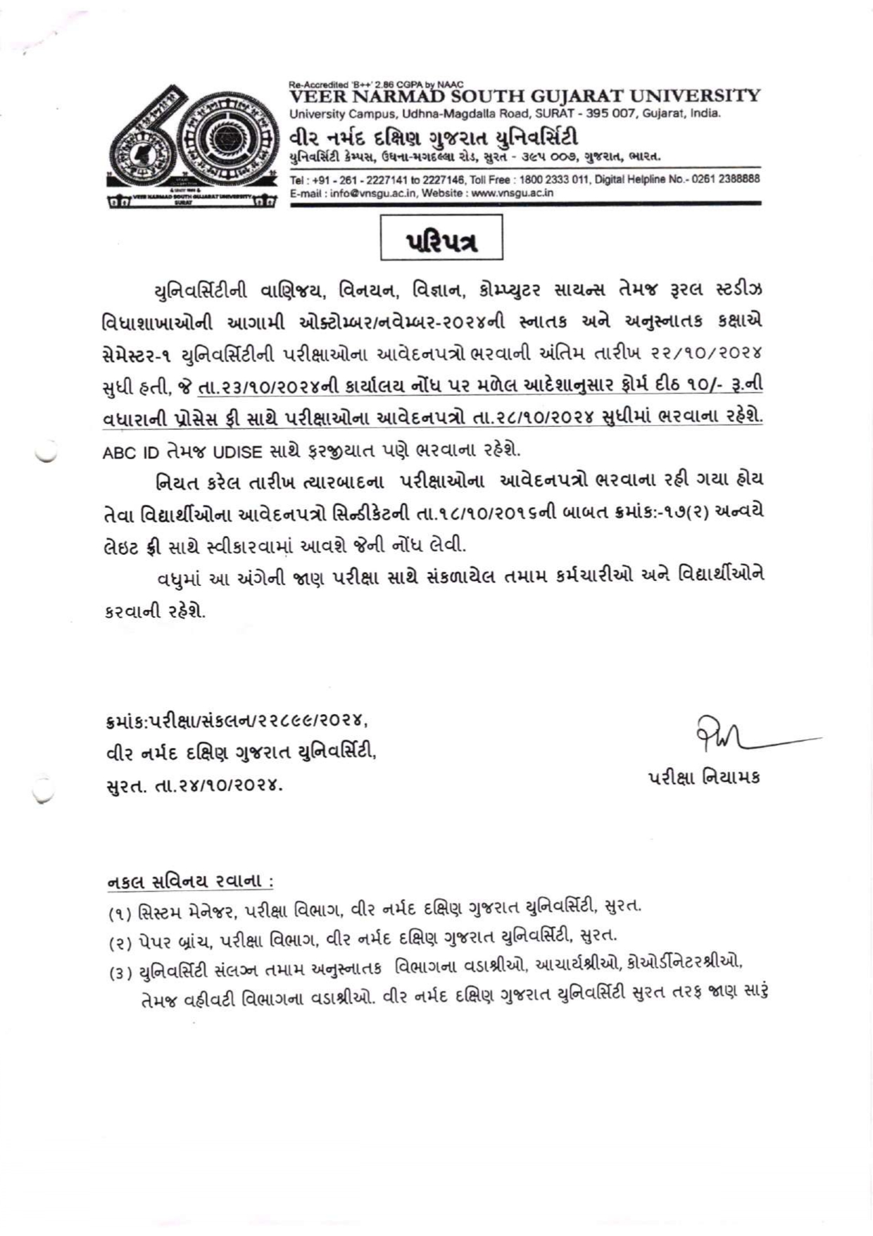 F.Y.B.COM SEM-1 NEP NOVEMBER-2024 ની યુનિવર્સીટી પરીક્ષાના ફોર્મ ભરવાની તારીખ નીચે આપેલ યુનિવર્સીટીના પરિપત્ર મુજબ રહેશે.