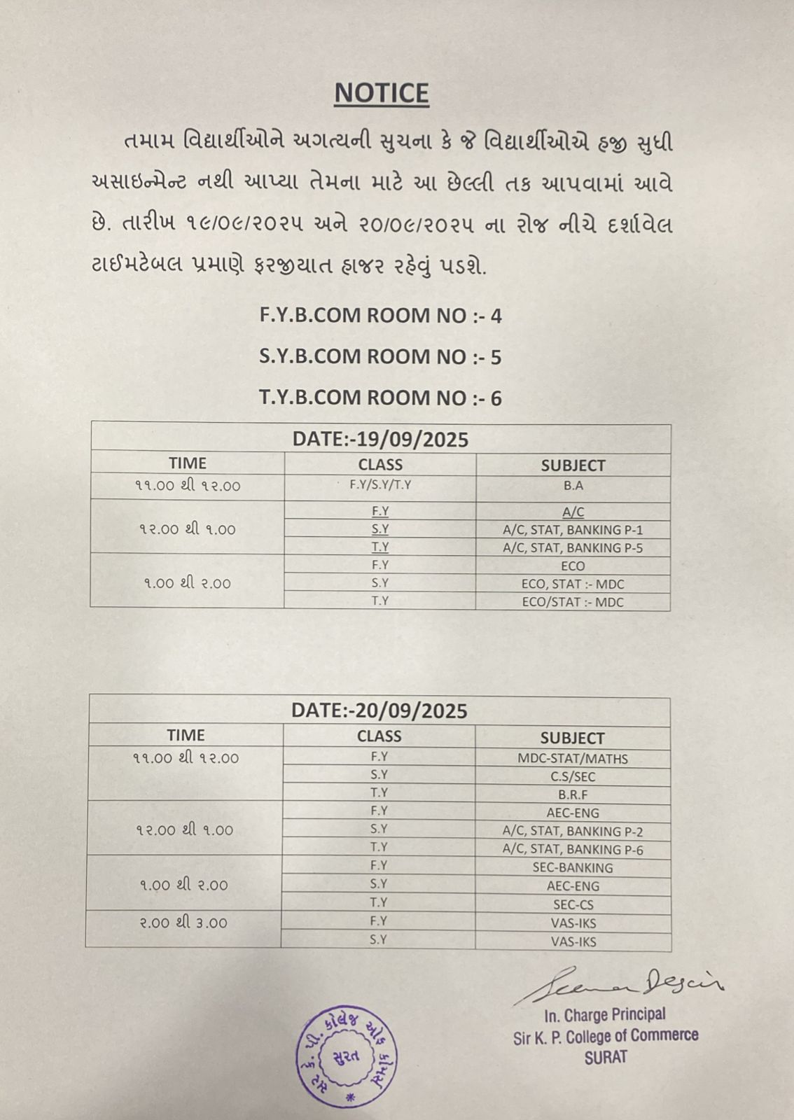 અસાઈન્મેન્ટ માટે ખાસ નોટીસ:- તમામ વિદ્યાર્થીઓ માટે અસાઈન્મેન્ટ જમા કારવવાની છેલ્લી તક આપવામાં આવે છે જેની તારીખ, સમય અને ક્લાસ નીચે મુજબના રહેશે. Sep 11, 2025
